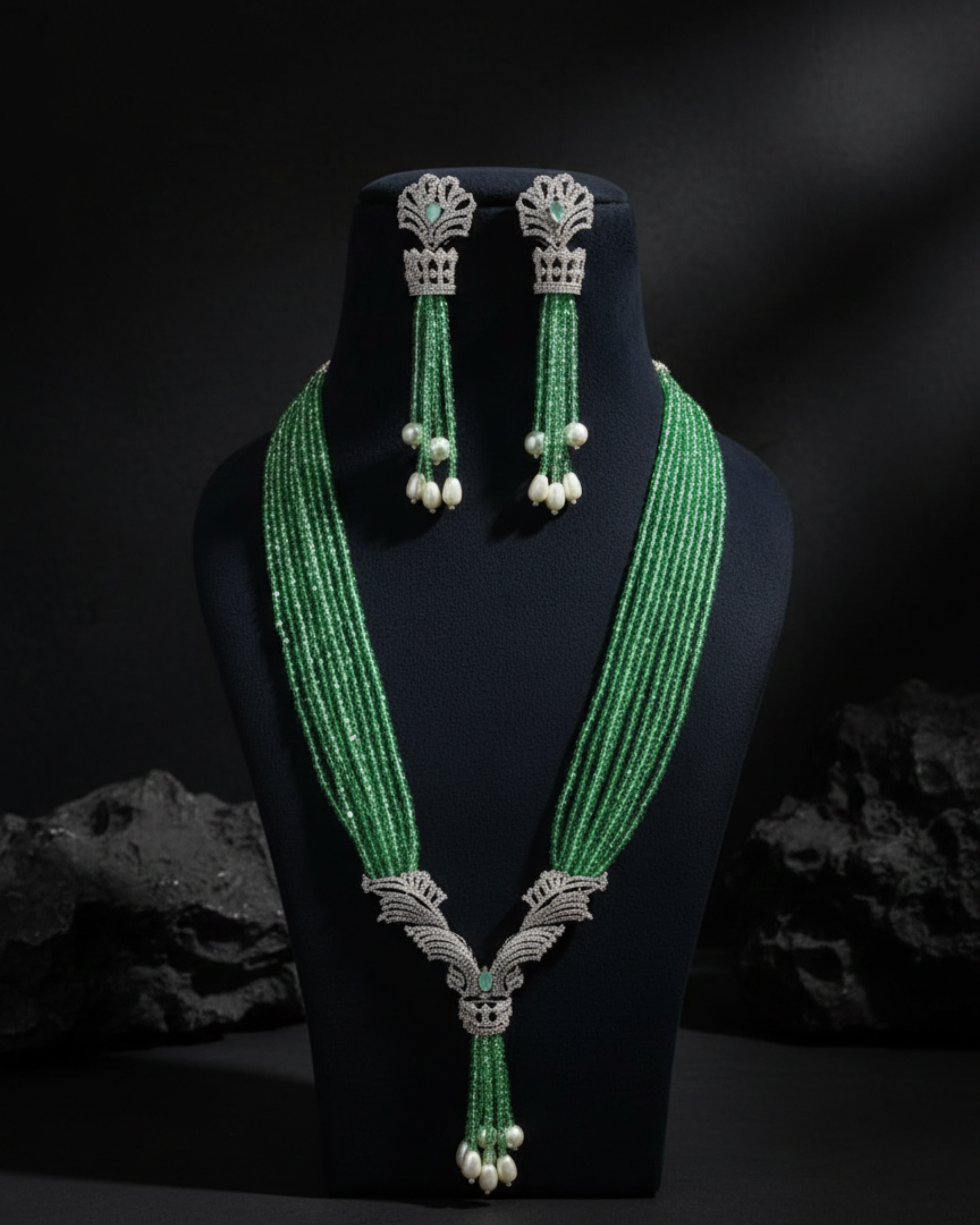 Aarvika Royale Beaded Neckpiece is a sophisticated creation that blends graceful bead strands with a striking central motif inspired by classic heritage design. The elongated silhouette flows beautifully, while the finely detailed centrepiece adds a regal focal point. Paired with matching statement earrings featuring delicate drops, this neckpiece is ideal for weddings, festive occasions, and refined evening ensembles, offering timeless elegance with a modern finish.