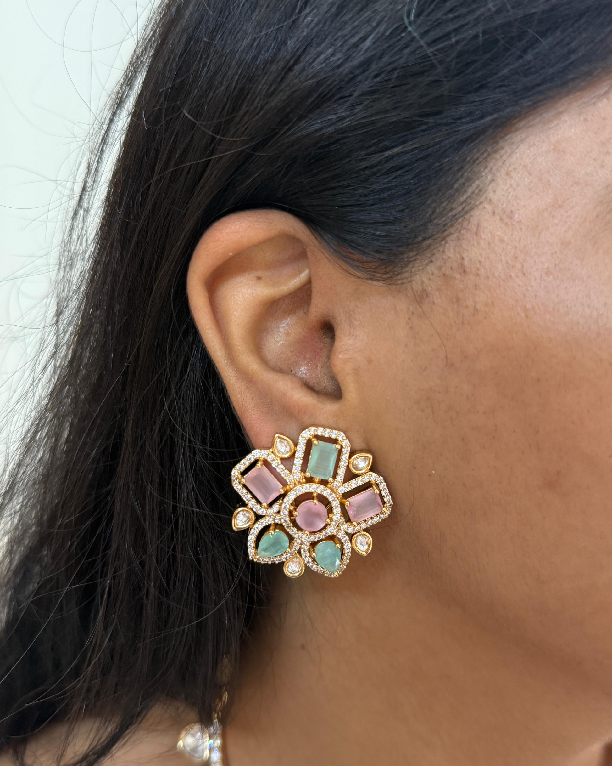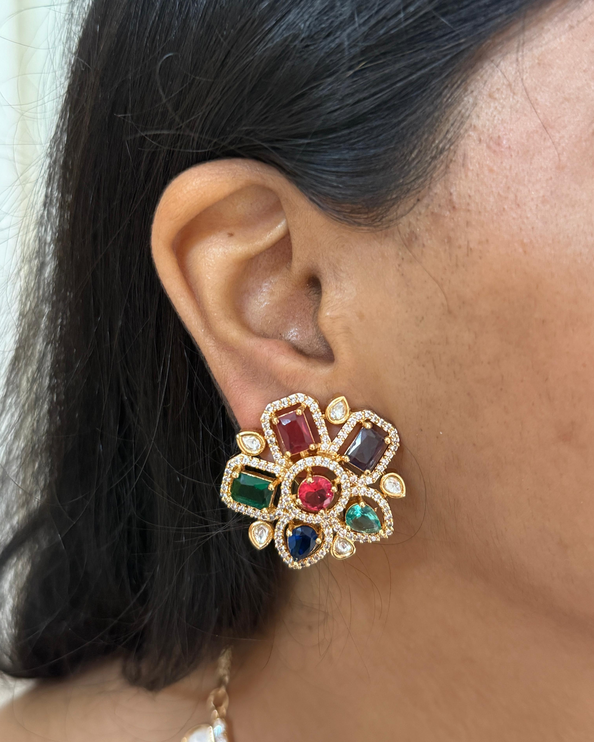 A graceful necklace set adorned with a line of finely cut stones, highlighted by a floral-inspired motif on one side. The elegant detailing and unique placement create a perfect blend of traditional artistry and modern sophistication, making it an eye-catching choice for any special occasion.