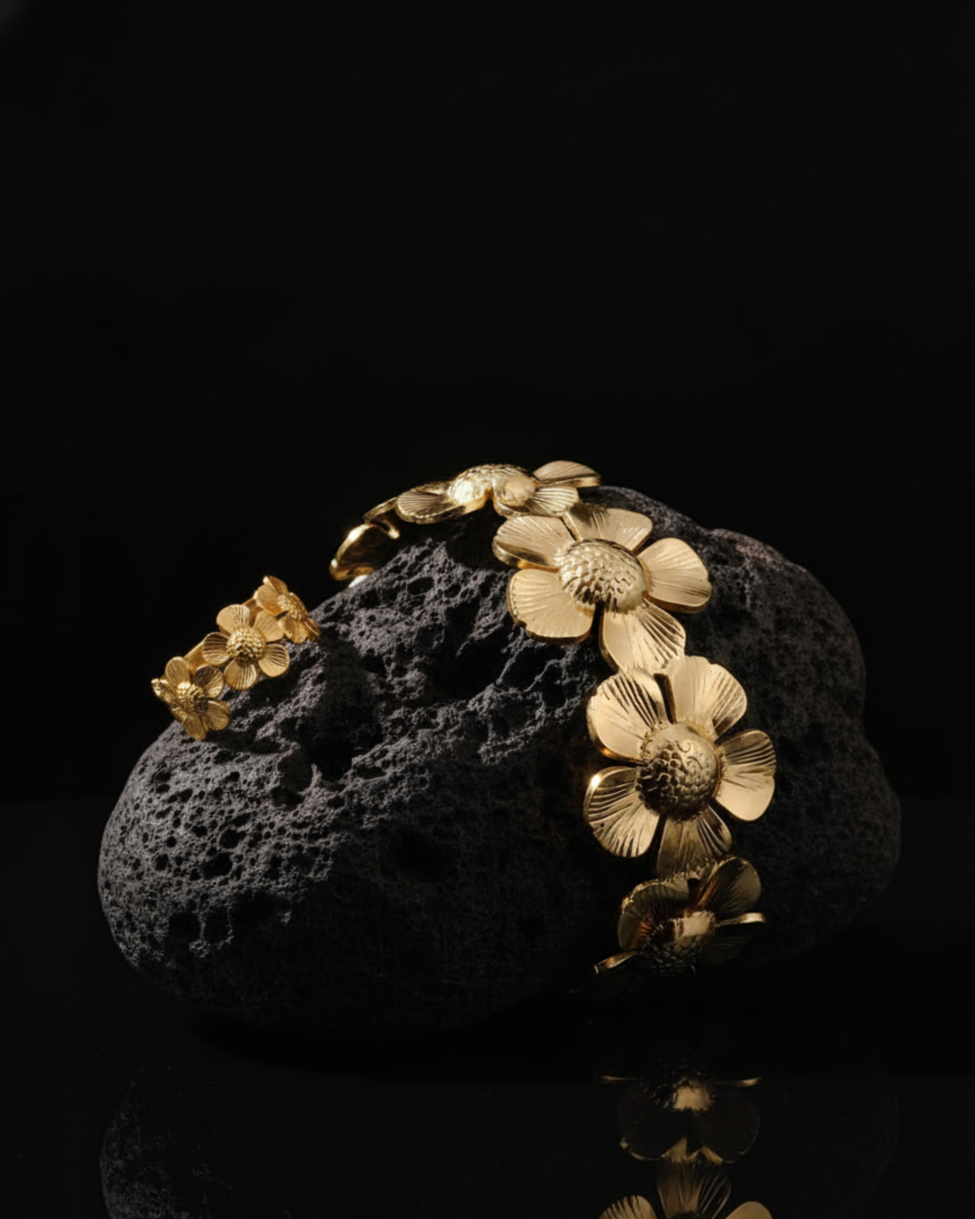 This jewellery combo features a luxurious bracelet and matching ring crafted in gleaming gold-tone metal, both designed to resemble elegant, flowing leaves, hearts, flowers etc. The intricate each patterns on each piece evoke a sense of nature's beauty and sophistication, making the set perfect for special occasions or adding statement glamour to everyday outfits. It beautifully captures the essence of organic form and timeless elegance, sure to mesmerize and delight anyone who wears it.