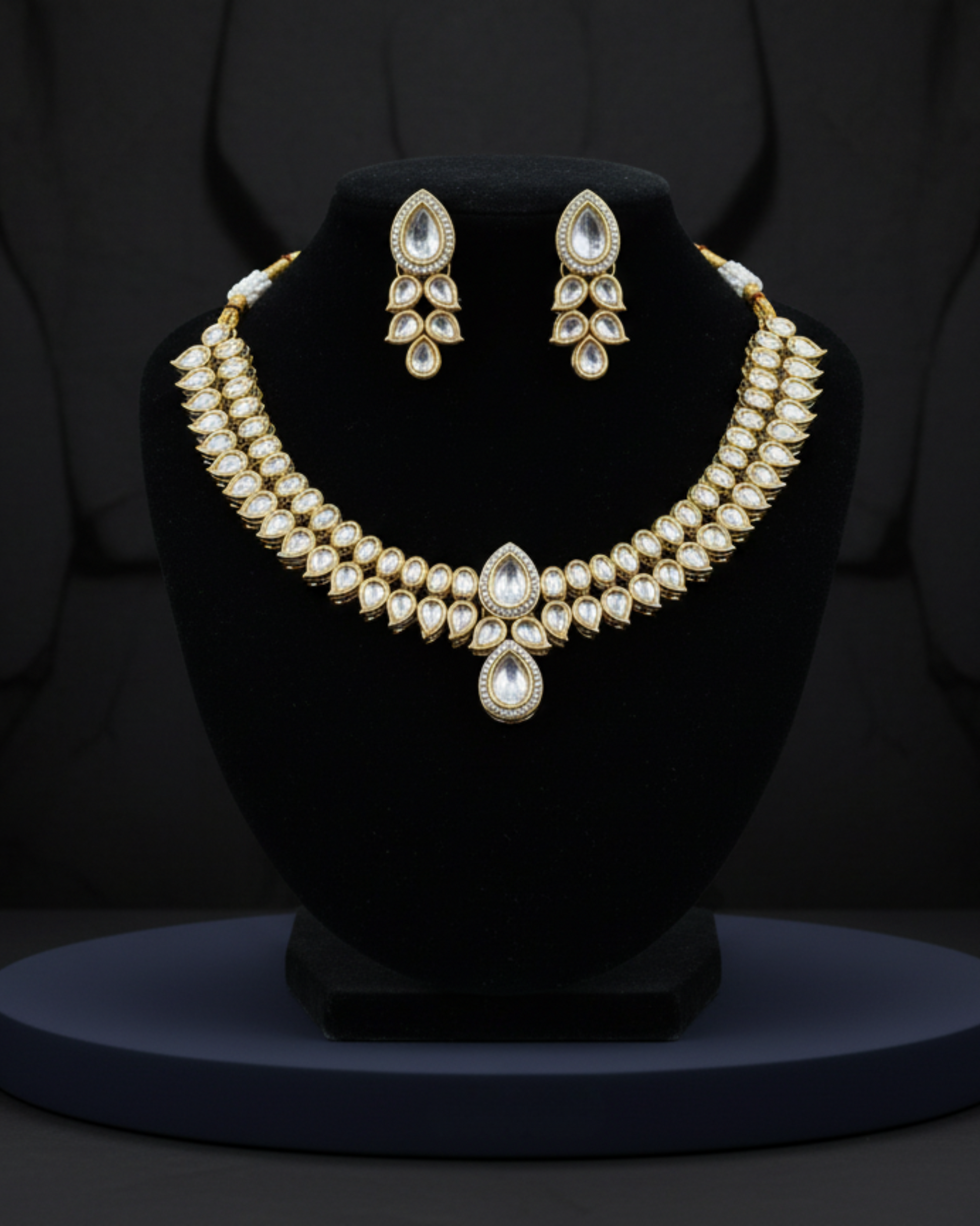 The Dewdrop royale Set is an exquisite creation that blends timeless tradition with regal allure. Featuring rows of pear-shaped kundan stones, highlighted with a grand central motif and matching earrings, this set exudes sophistication and brilliance. The golden framework enhances the radiance of each stone, making it an ideal choice for weddings, festive occasions, and grand celebrations. A perfect balance of elegance and opulence, this set ensures you shine with royal grace.