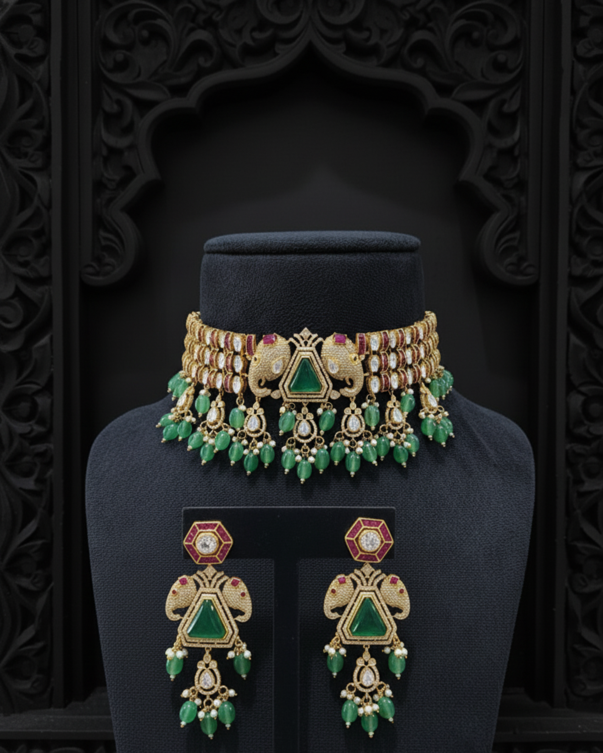 This piece is a majestic choker set featuring a broad, gold-toned band richly embellished with polki-style clear stones and bordered by a row of vibrant ruby-colored gemstones. The centerpiece showcases traditional elephant motifs flanking a large, brilliant emerald-cut green stone, with elegant drops of clustered clear stones and polished emerald beads hanging beneath. This ornate choker is complemented by a voluminous, cascading multi-strand necklace made of numerous small, polished light-green beads, creating a layered, regal look perfect for a traditional Indian wedding or grand festive occasion, blending classic design elements with rich color and texture.