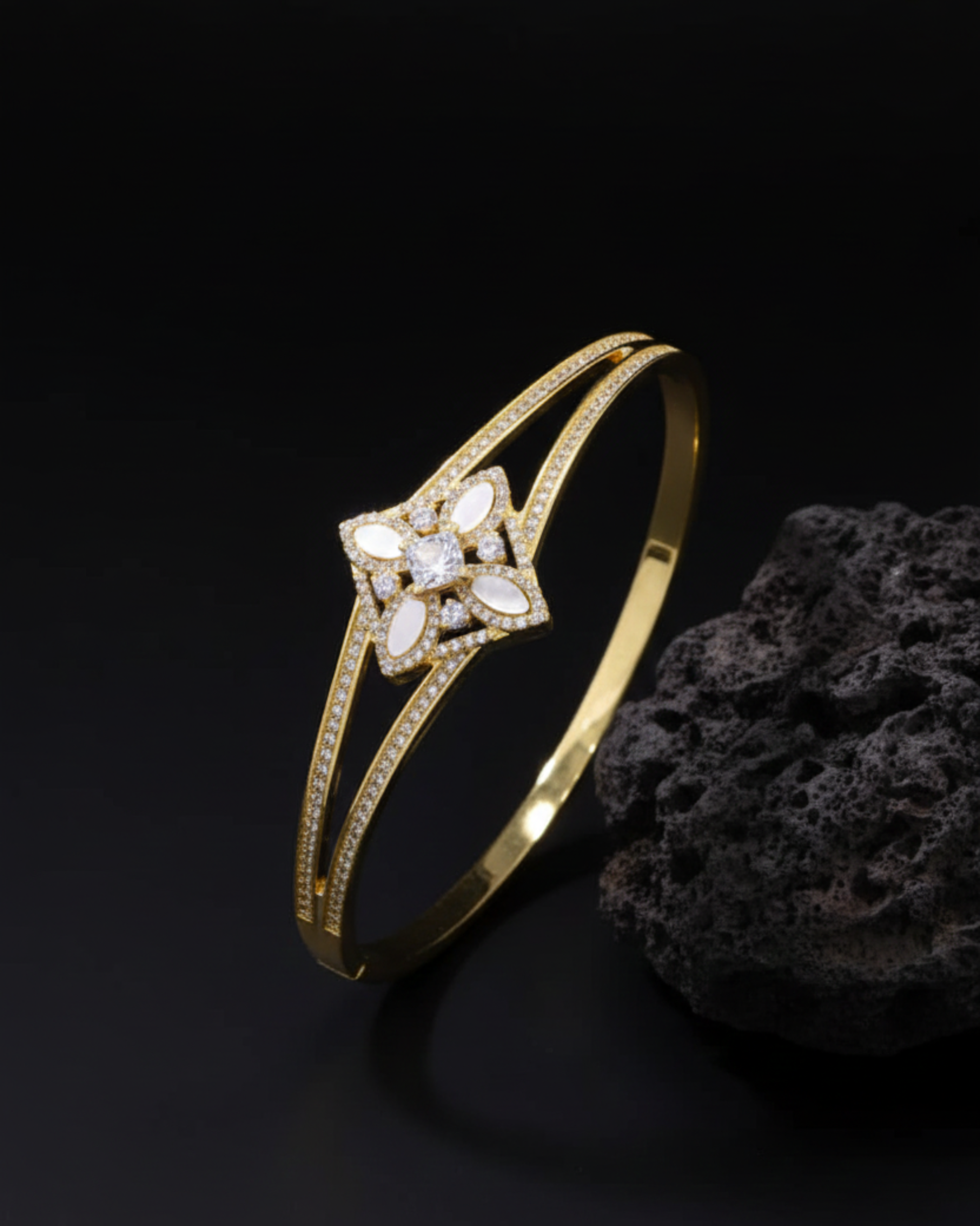 The Floral Radiance Bracelet is a graceful fusion of modern charm and classic elegance. Featuring a beautifully crafted floral centerpiece adorned with sparkling stones, it rests on a dual-line gold band that adds a sleek and refined touch. The intricate detailing and brilliant shine make this bracelet perfect for festive occasions, weddings, or evening wear. Lightweight yet luxurious, it enhances every wrist with feminine sophistication and timeless beauty.
