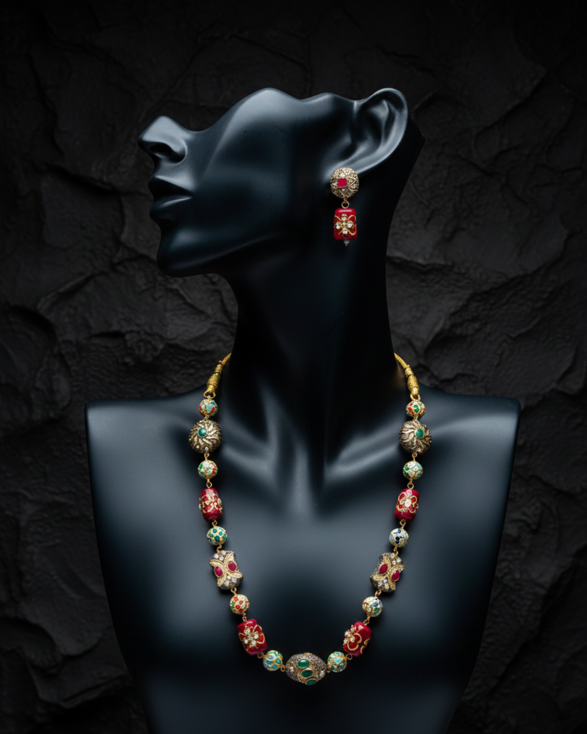This exquisite mala showcases a regal blend of intricately crafted enamel beads paired with ornate, antique-style elements that highlight traditional artistry. Each bead features detailed motifs, creating a rich interplay of patterns and textures. The central beads add a statement touch, while the matching earrings complete the set with graceful harmony. Designed for those who appreciate timeless craftsmanship, this mala embodies cultural elegance and makes a striking addition to festive and ceremonial looks.