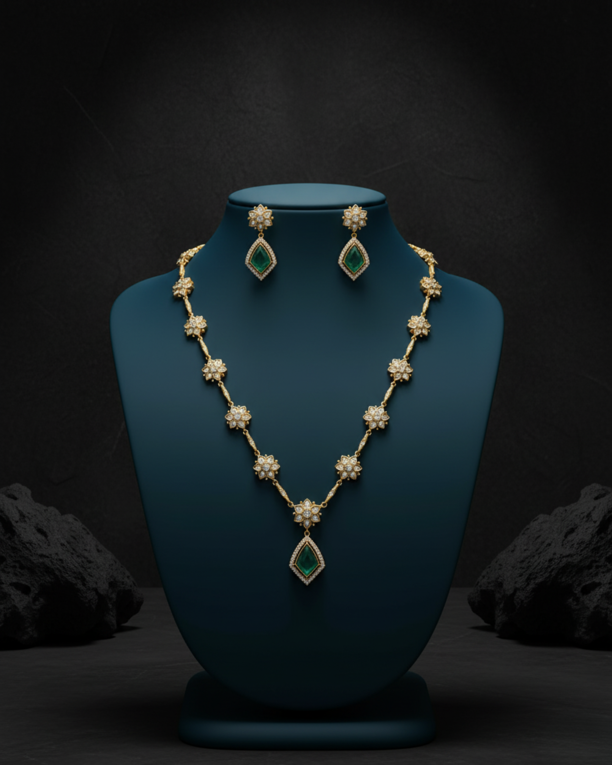 The Iraa Floral Grace Necklace Set embodies delicate sophistication with its dainty floral motifs and refined detailing. Each flower is encrusted with shimmering stones, linked gracefully along the chain to create an elegant flow. The pendant and earrings feature geometric drops framed with sparkling accents, adding a modern touch to the traditional design. Perfect for festive gatherings or elegant soirées, this set beautifully balances subtle charm with timeless allure.