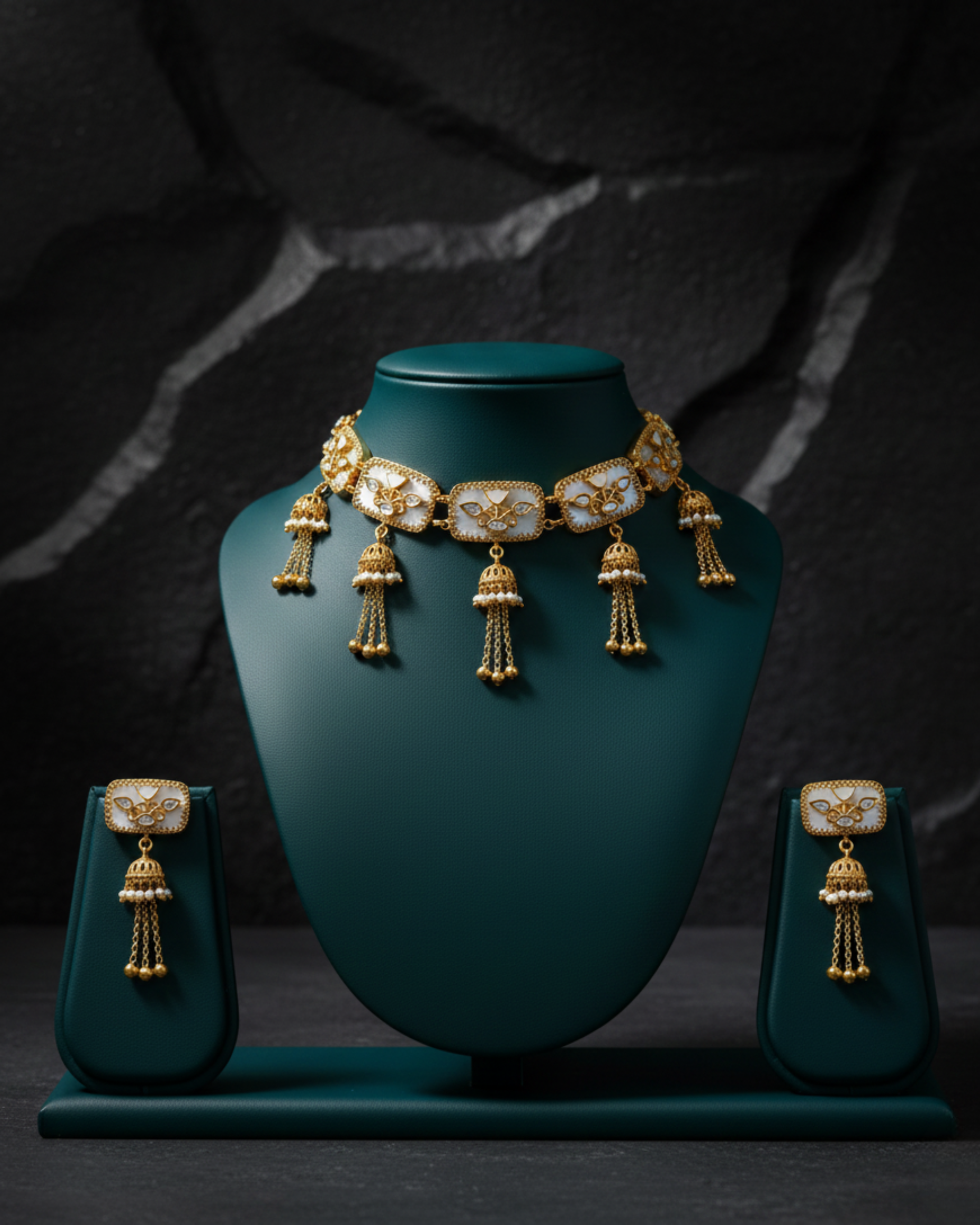 The Jhoomar MOP Choker Set is a charming blend of traditional elegance and artisanal craftsmanship. Designed with delicate enamel panels adorned with floral motifs, this choker captures the beauty of heritage jewellery in a refreshing contemporary style. The highlight of the piece is its beautifully crafted jhoomar-inspired danglers, featuring fine chains, jali work, and dainty pearls that add graceful movement and regal charm. Lightweight yet statement-worthy, this choker is perfect for festive occasions, weddings, and intimate celebrations, giving your look a timeless and artistic touch.