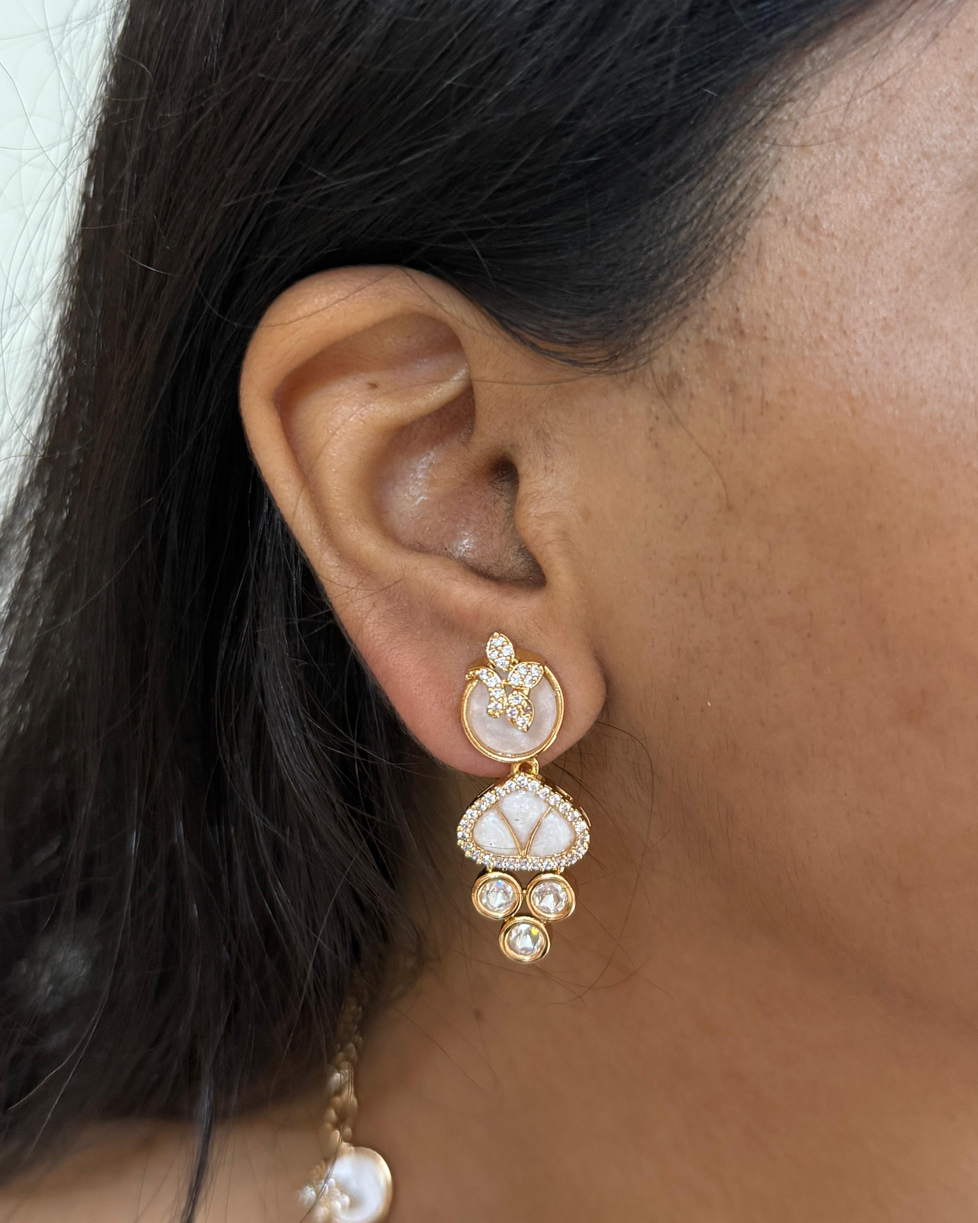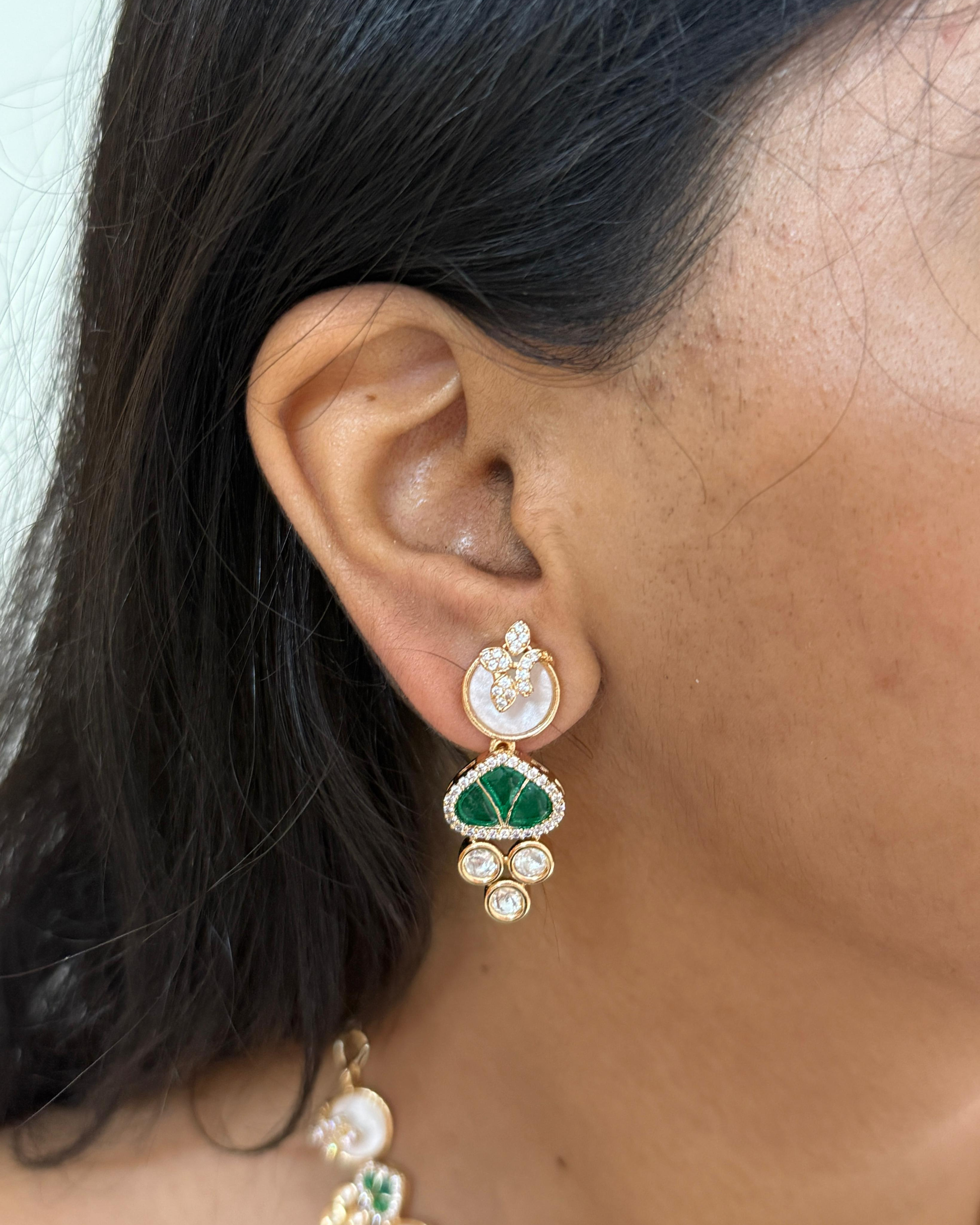 The Luner Necklace Set captures the serene glow of the moon with its luminous mother-of-pearl accents framed in radiant gold. Embellished with delicate floral motifs and sparkling stones, this set reflects a perfect harmony of elegance and grace. Ideal for festive celebrations, weddings, or evening soirées, it adds a celestial charm to every look.