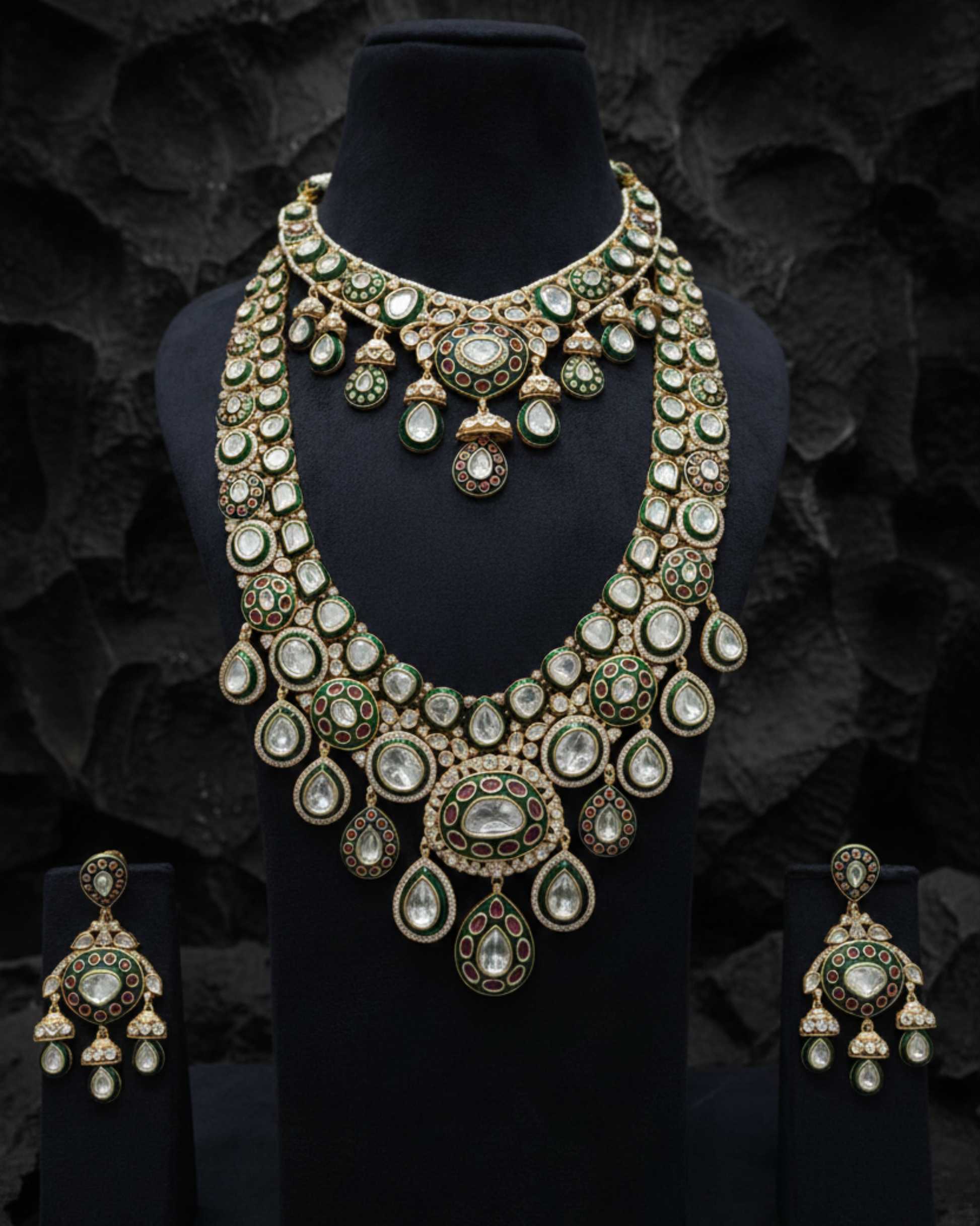 The Maharani Timeless Bridal Set is a celebration of regal elegance and traditional craftsmanship. Designed with intricately placed mossinate kundan stones and detailed handwork, this statement necklace creates a majestic layered look fit for a royal bride. The ornate central motif paired with graceful drops adds richness and depth, while the perfectly coordinated earrings enhance its grand appeal. Ideal for weddings and special ceremonies, this bridal set embodies heritage charm with a timeless, luxurious finish.