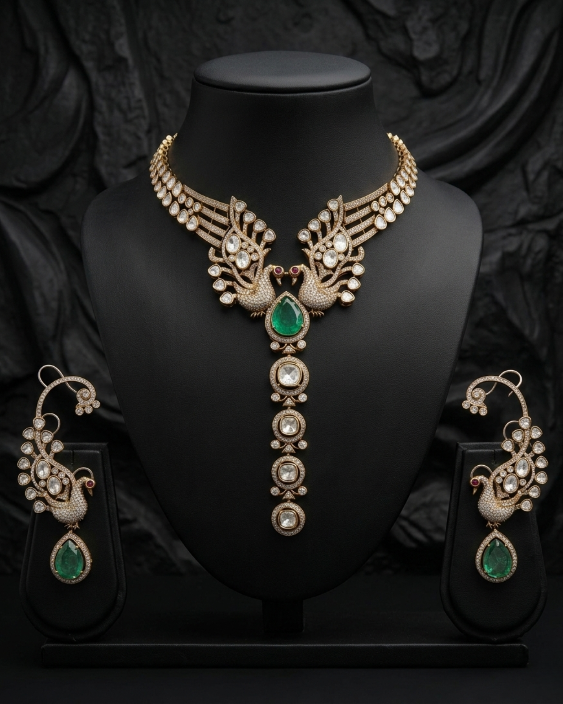 The Mayurika Kundan Necklace Set is a majestic piece inspired by graceful peacock motifs and intricate traditional craftsmanship. Adorned with finely set moissanite kundan stones, the design features elegant detailing and a statement drop pattern that adds royal charm to the neckline. Paired with beautifully crafted matching earrings, this set reflects timeless heritage and grandeur, making it a perfect choice for weddings, festive occasions, and special celebrations where you want to carry a regal and sophisticated look.