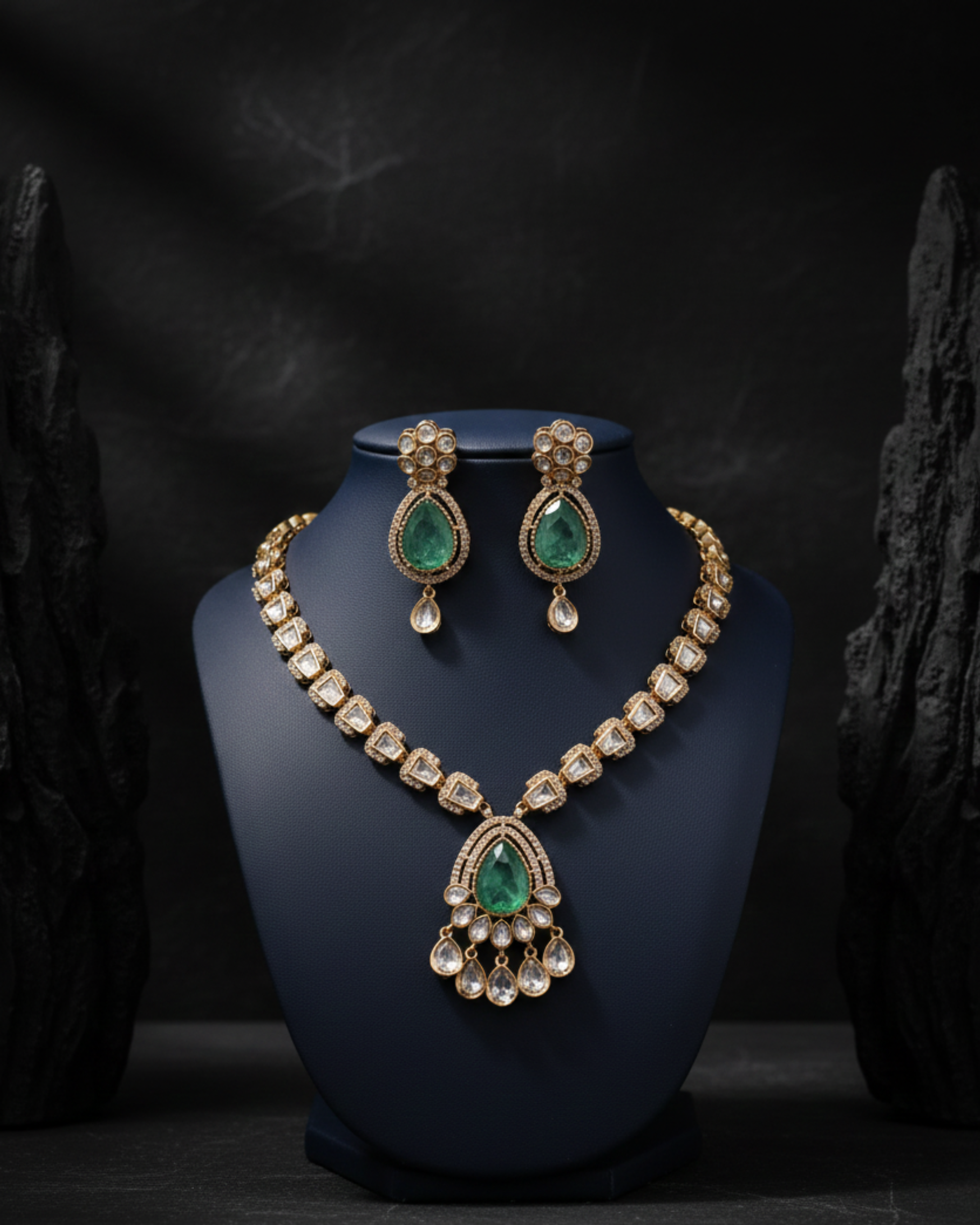 The Meghara Royal Drop Necklace Set is an exquisite blend of regal charm and intricate craftsmanship, designed to make every occasion feel grand. Featuring a stunning teardrop centerpiece adorned with sparkling stones and a cascade of delicate drop motifs, this necklace beautifully frames the neckline with timeless elegance. The bold teardrop earrings perfectly complement the pendant, creating a harmonious and luxurious look. With its detailed stonework, graceful silhouette, and rich traditional aesthetic, this set is ideal for weddings, festive celebrations, and statement-making moments. It adds a touch of royal allure to any outfit, ensuring you stand out with unmatched sophistication.