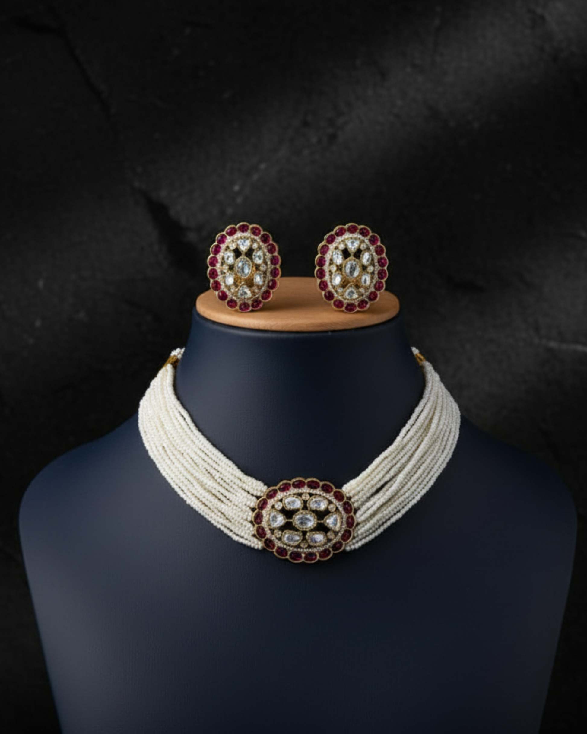 The Multi-Strand Pearls Choker Set is a timeless accessory that reflects elegance and grace. With layers of finely crafted pearl strands, this choker offers a rich texture and a sophisticated appeal. The intricately designed centerpiece, adorned with sparkling stones, adds a touch of luxury while maintaining a refined aesthetic. Perfect for weddings, festive gatherings, or formal events, this set effortlessly enhances traditional and contemporary attire, making it a versatile and cherished piece in any jewellery collection.