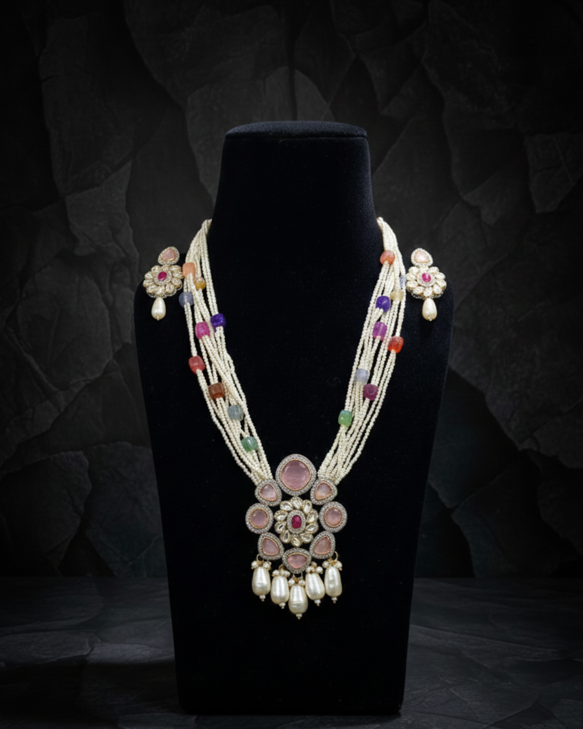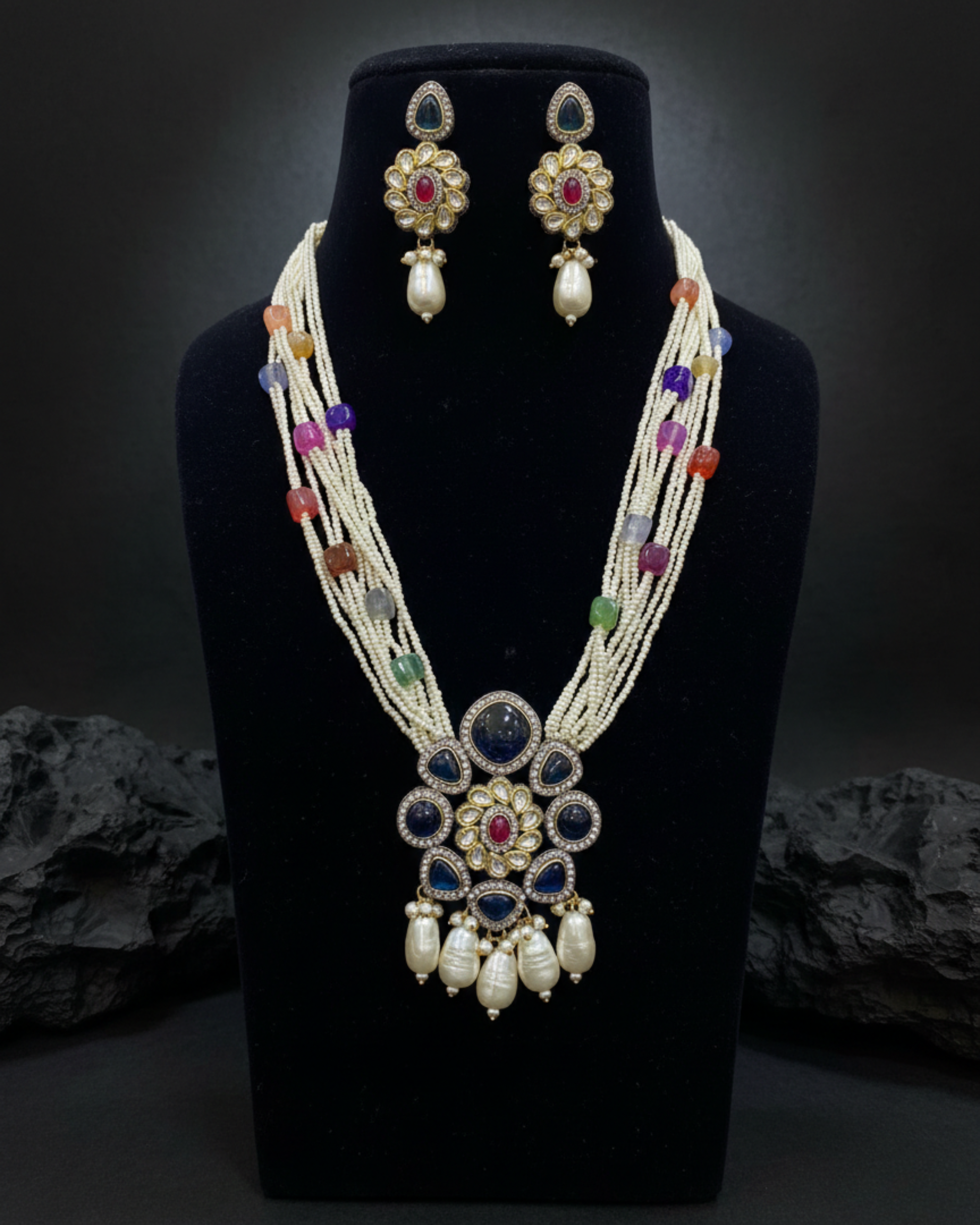 The Navira Heritage Pendant Mala features multiple strands of finely strung beads accented with handcrafted detailing, leading to an ornate floral-inspired pendant. Finished with graceful drop elements and paired with matching earrings, this set reflects traditional artistry and timeless charm, making it ideal for festive occasions, weddings, and cultural celebrations.