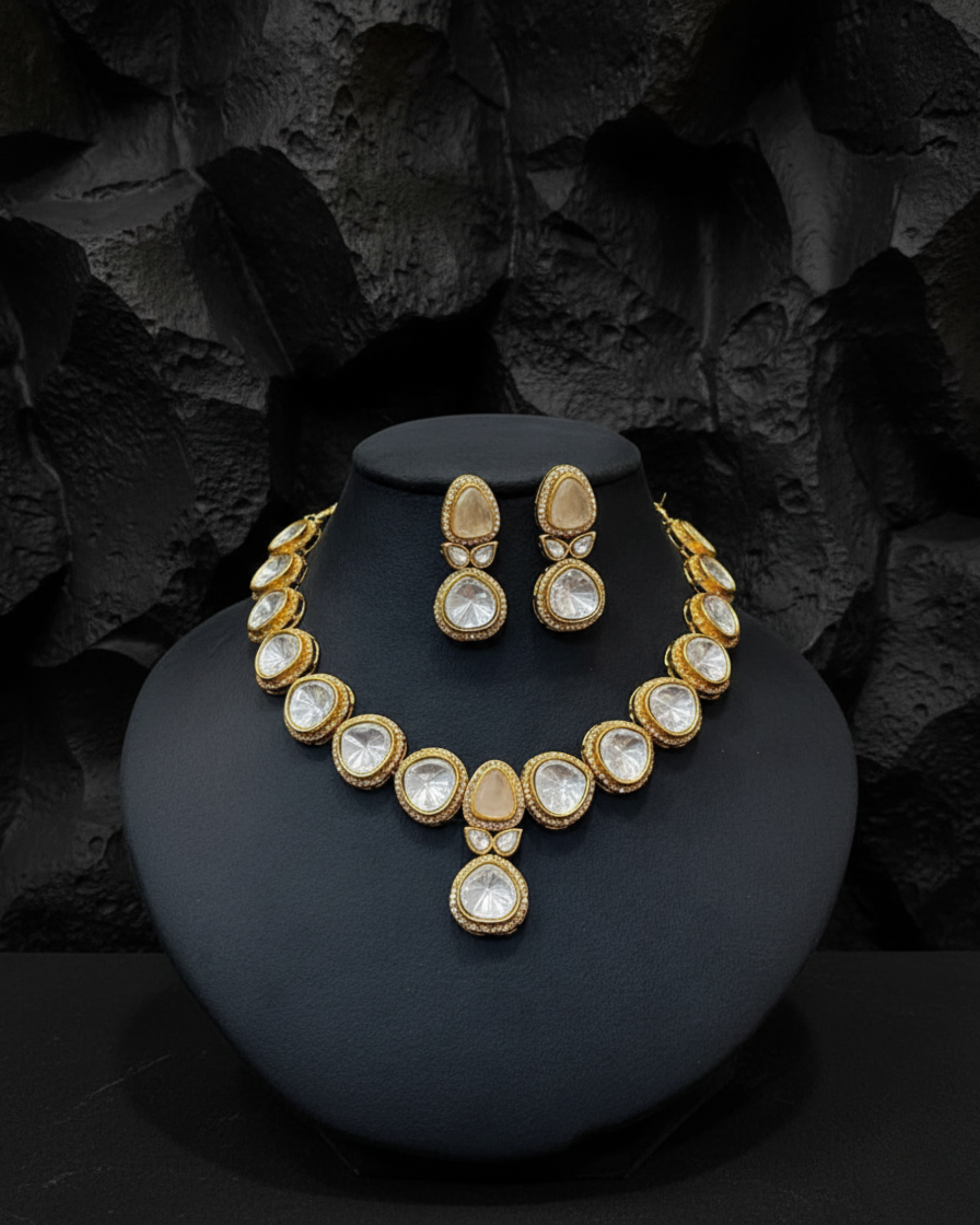 The Nivara Uncut Kundan Necklace Set is a striking blend of regal heritage and modern refinement. Featuring meticulously crafted uncut kundan stones bordered with delicate detailing, this necklace radiates timeless allure. The statement pendant and matching earrings add a touch of grandeur, making it a perfect choice for brides, festive celebrations, or anyone who wishes to embody the elegance of royal traditions with contemporary grace.