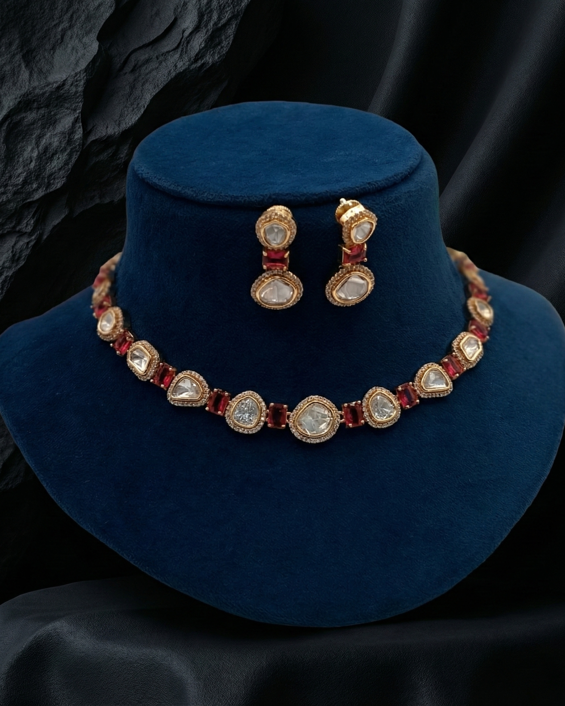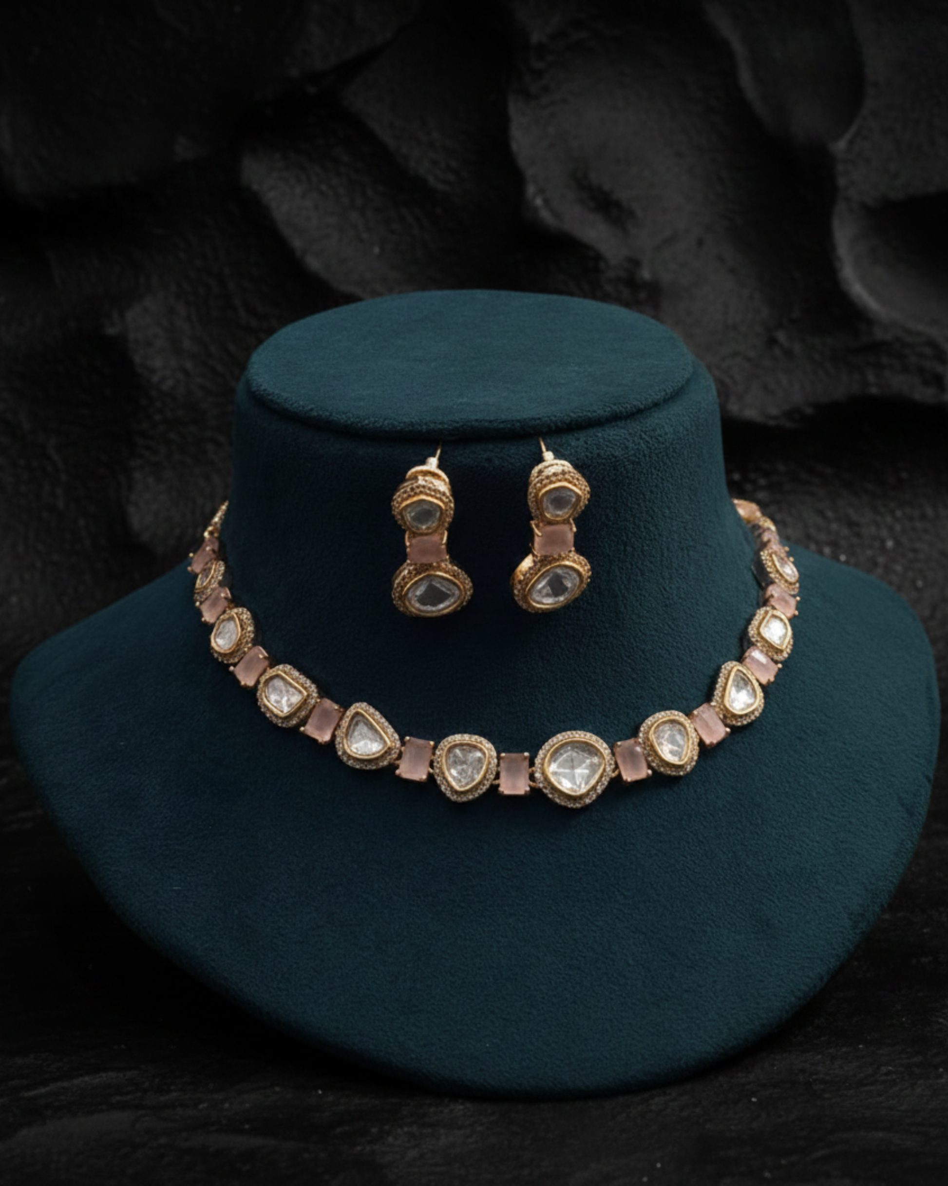 The Niyara Kundan Charm Necklace Set is a refined blend of traditional artistry and modern elegance. Designed with beautifully cut stones framed in intricate detailing, the necklace features alternating square and teardrop motifs that add richness to its appearance. Paired with matching drop earrings, this set offers a graceful and timeless look—perfect for weddings, festive celebrations, and special occasions. Lightweight yet luxurious, it elevates any outfit with effortless sophistication.