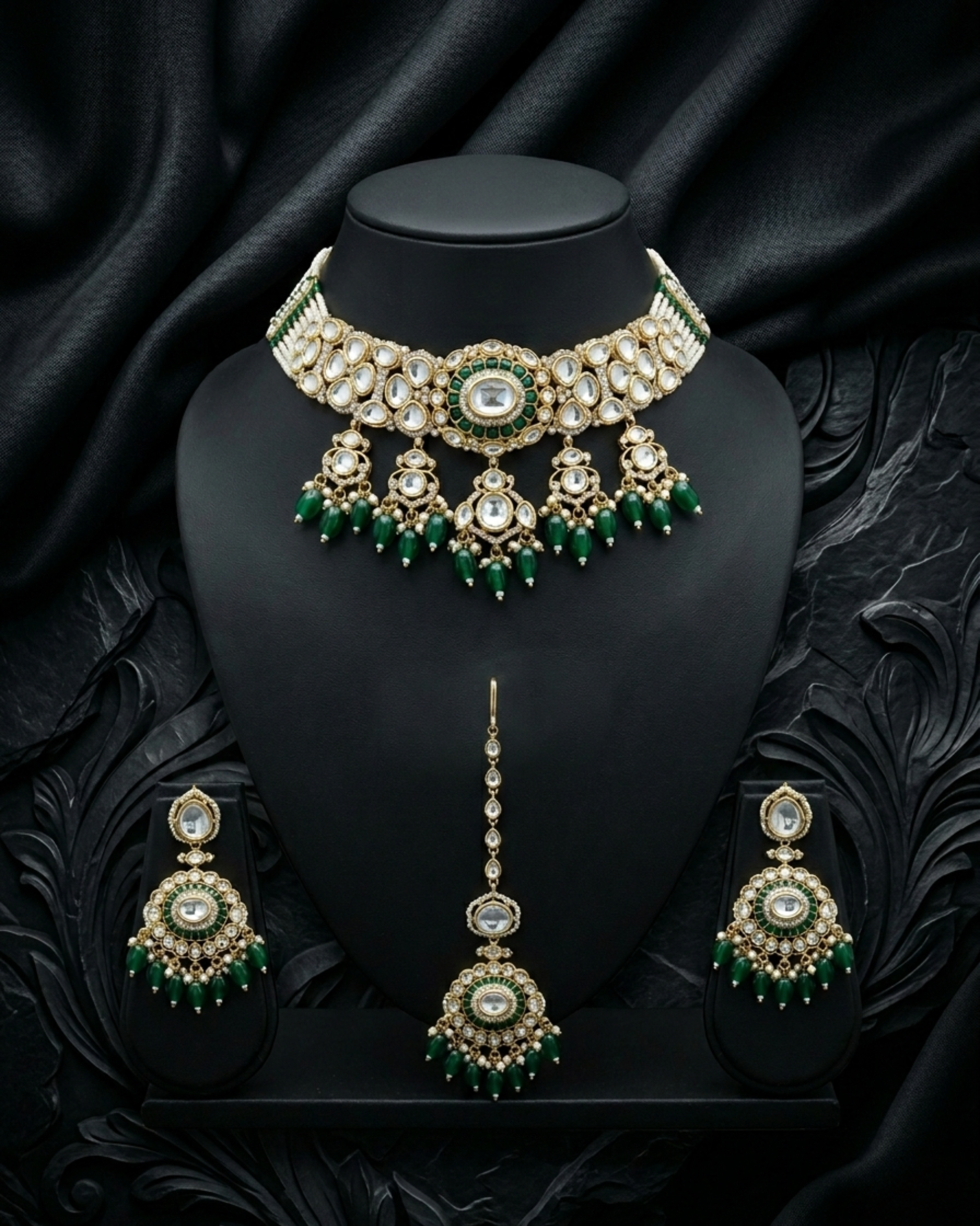 A beautifully crafted choker set designed to reflect timeless elegance and royal charm with Mossinate Kundan. The intricate stone work and detailed centerpiece create a graceful statement, while the layered bead strands add richness and depth to the design. Paired with matching statement earrings and a delicate maang tikka, this set brings a perfect blend of tradition and sophistication, making it an ideal choice for weddings, festive celebrations, and special occasions.