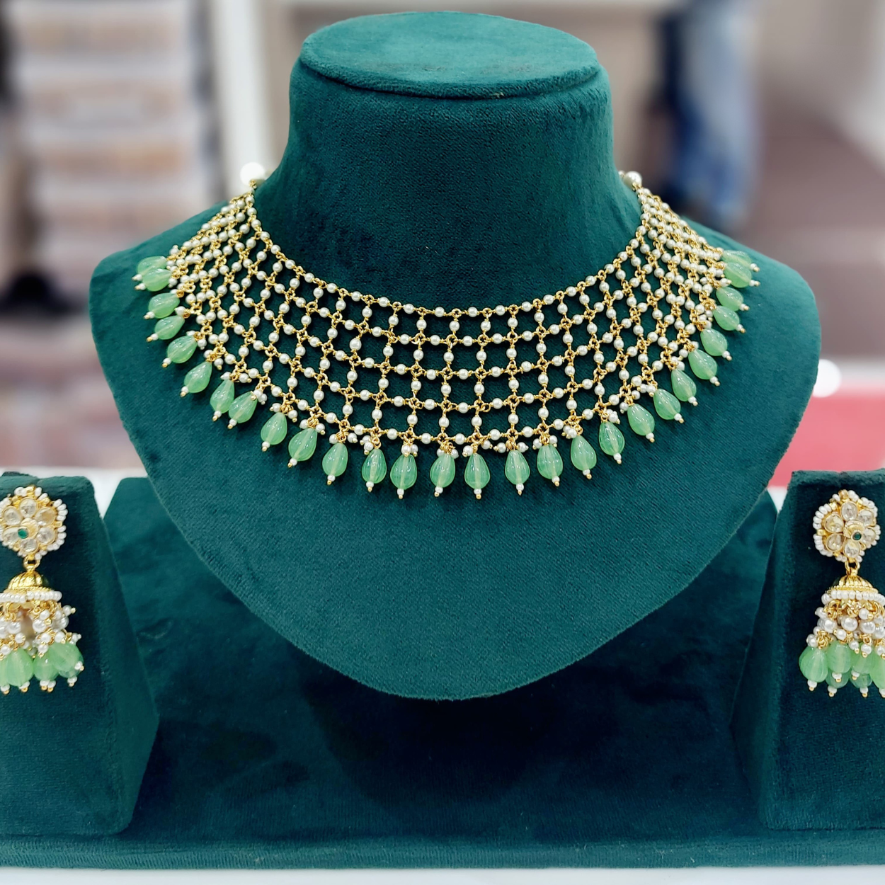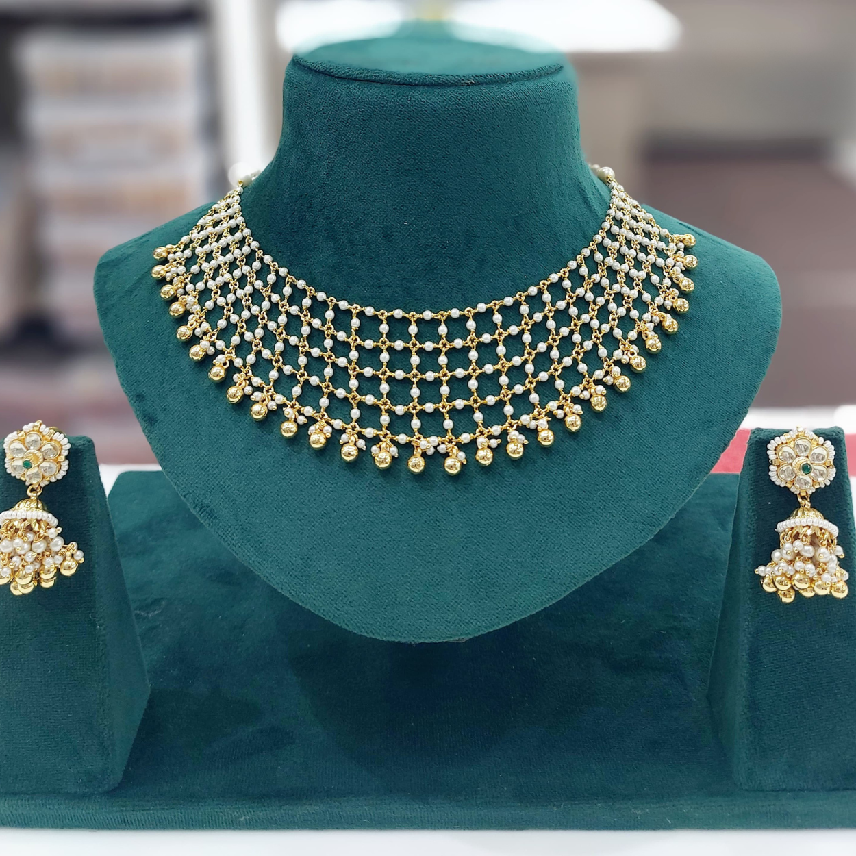 The Pearl Jaal Set is a captivating blend of traditional artistry and intricate design. Featuring a beautifully woven jaal (net) pattern crafted with delicate pearls and shimmering gold-toned beads, this choker-style necklace exudes regal charm. The matching jhumka earrings enhance its ethnic appeal with floral motifs and cascading pearl drops. Ideal for weddings, festive occasions, and cultural celebrations, this set adds an elegant, statement-making touch to any traditional ensemble.