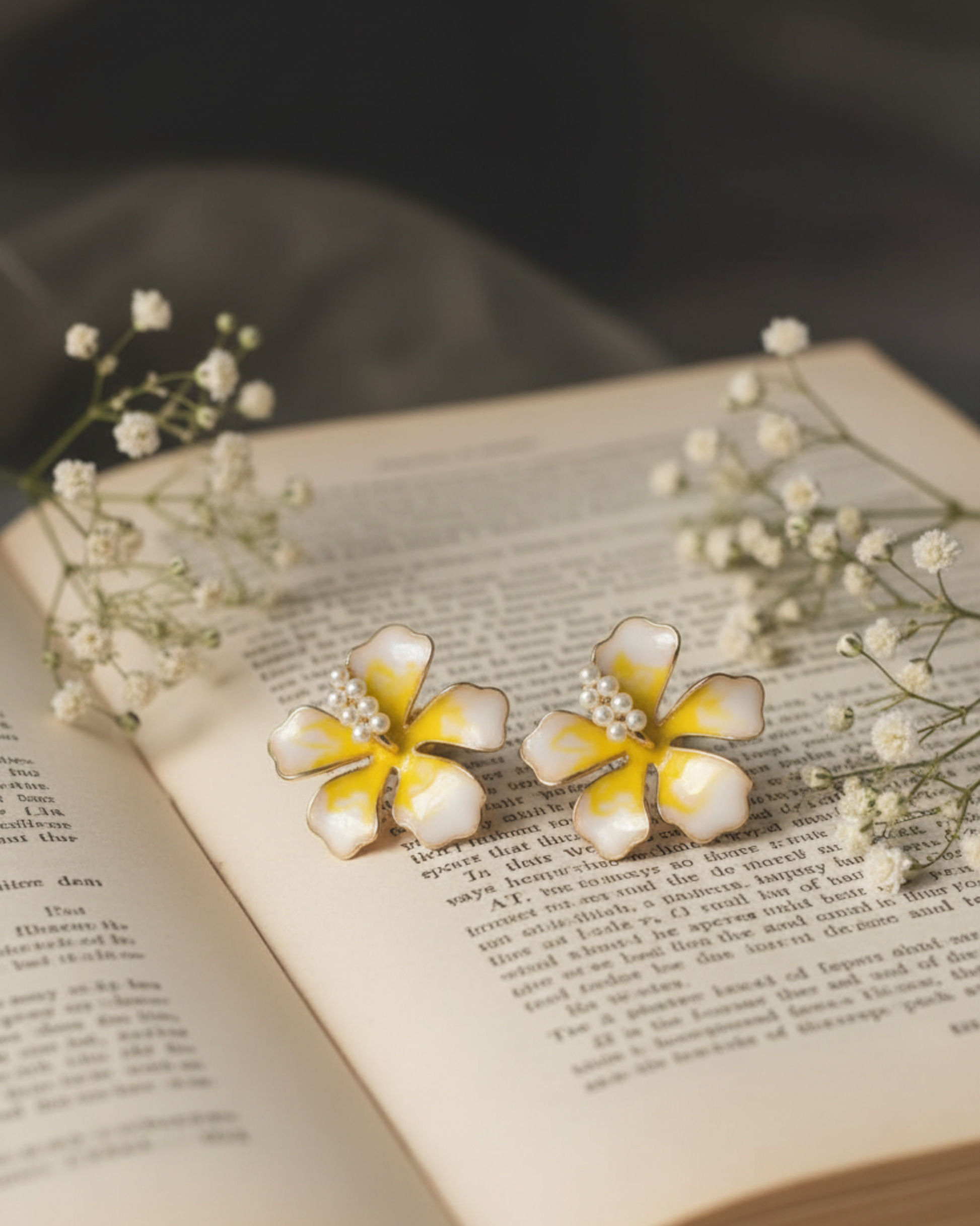 Inspired by the delicate beauty of spring blossoms, the Petal Pearl Bloom Earrings bring a fresh and feminine charm to your look. Each petal is artistically crafted with a glossy finish, centered with tiny pearls that add a hint of sophistication and grace. Lightweight and effortlessly stylish, these earrings are perfect for both casual outings and special occasions. Their floral elegance pairs beautifully with dresses, kurtis, or even modern silhouettes, making them a timeless addition to your jewellery collection.