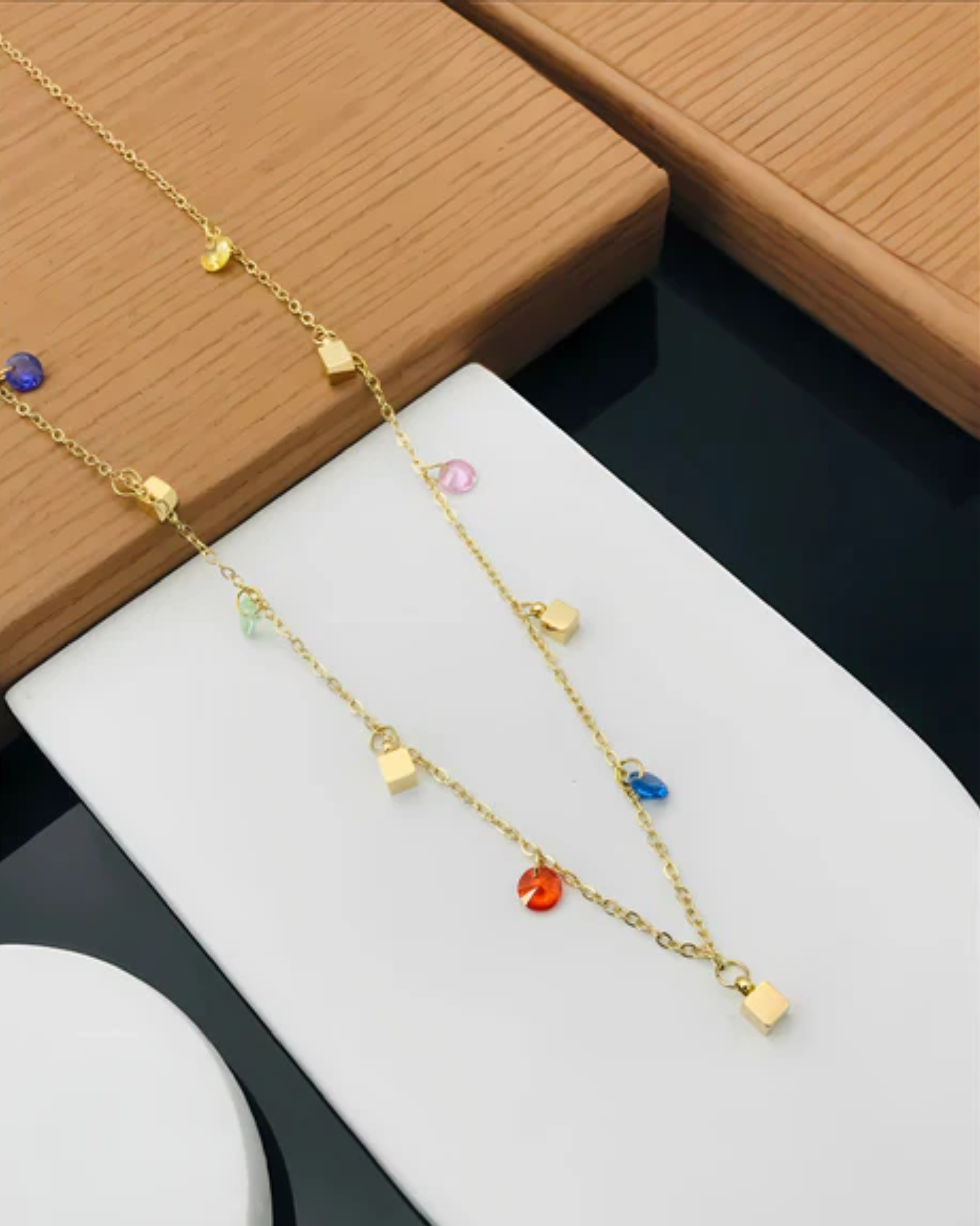 The Prism Lock Necklace is a contemporary gold-toned chain featuring a playful mix of tiny gold lock charms and vibrant multicolored crystal drops. Each charm adds a unique pop of color, from bold reds and blues to soft pastels, creating a fun yet elegant aesthetic. The combination of sleek geometric locks and shimmering glass-like beads makes this necklace a standout piece that blends whimsy with modern sophistication. Perfect for elevating casual wear or adding flair to minimalist outfits, it's a bold expression of color and charm.