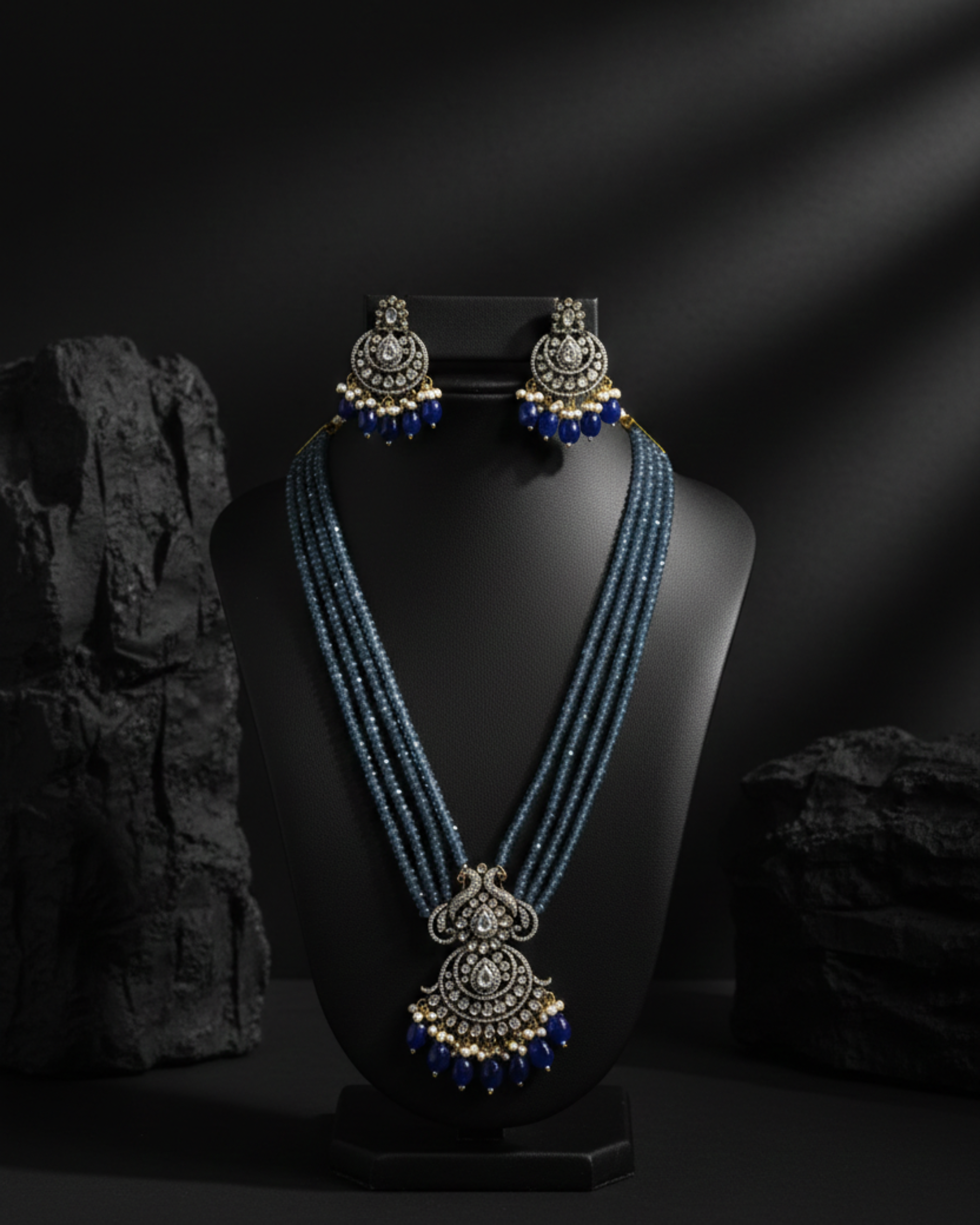 A regal designer mala set crafted with multiple fine bead strands that flow gracefully into an intricately detailed peacock-inspired pendant. Adorned with shimmering stone work, delicate pearl accents, and elegant drop elements, this set beautifully blends traditional artistry with royal charm. Paired with matching statement earrings, it’s a perfect choice for weddings, festive occasions, and grand celebrations where you want to make a majestic impression.