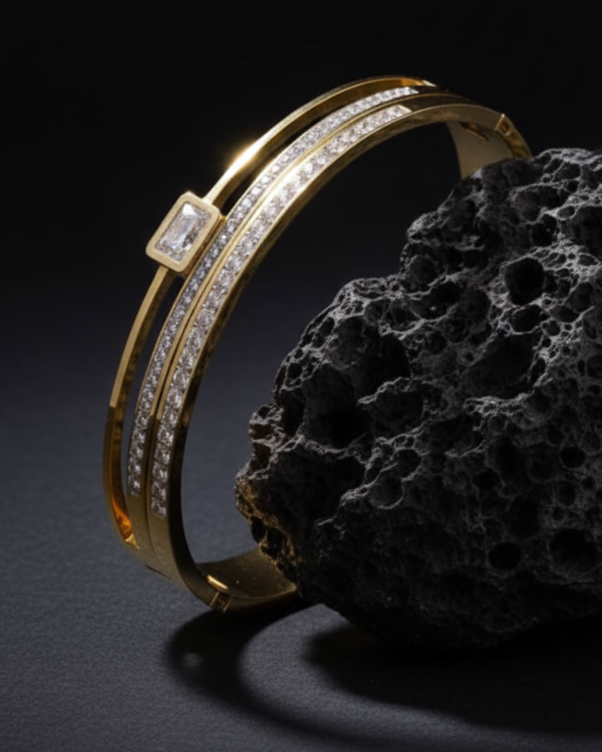 This anti- tarnish, sleek and contemporary bracelet features a refined dual-band design highlighted by a row of shimmering stones that add subtle brilliance without overpowering the piece. At its center rests a beautifully set solitaire-style stone, creating an elegant focal point that elevates the bracelet’s modern aesthetic. Lightweight yet luxurious, this piece is perfect for everyday sophistication or for adding a touch of understated glamour to any special occasion.