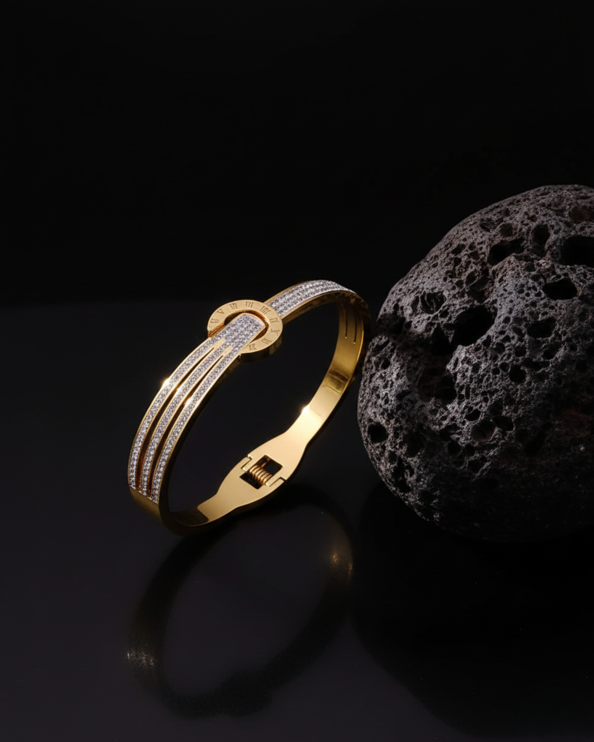 The Riva Band is the epitome of sophisticated luxury, featuring a stunning gold-tone design that gracefully splits into two bands, both lavishly set with brilliant, pave-style cubic zirconia stones for continuous sparkle. Anchoring the design is the unique, horseshoe-shaped clasp, subtly detailed with classic Roman numerals, adding a touch of timeless, watch-inspired elegance. Complete with a secure hinged closure, this cuff is easy to wear and comfortable, making it the perfect statement piece to instantly elevate your look from a casual daytime outing to night occasions.