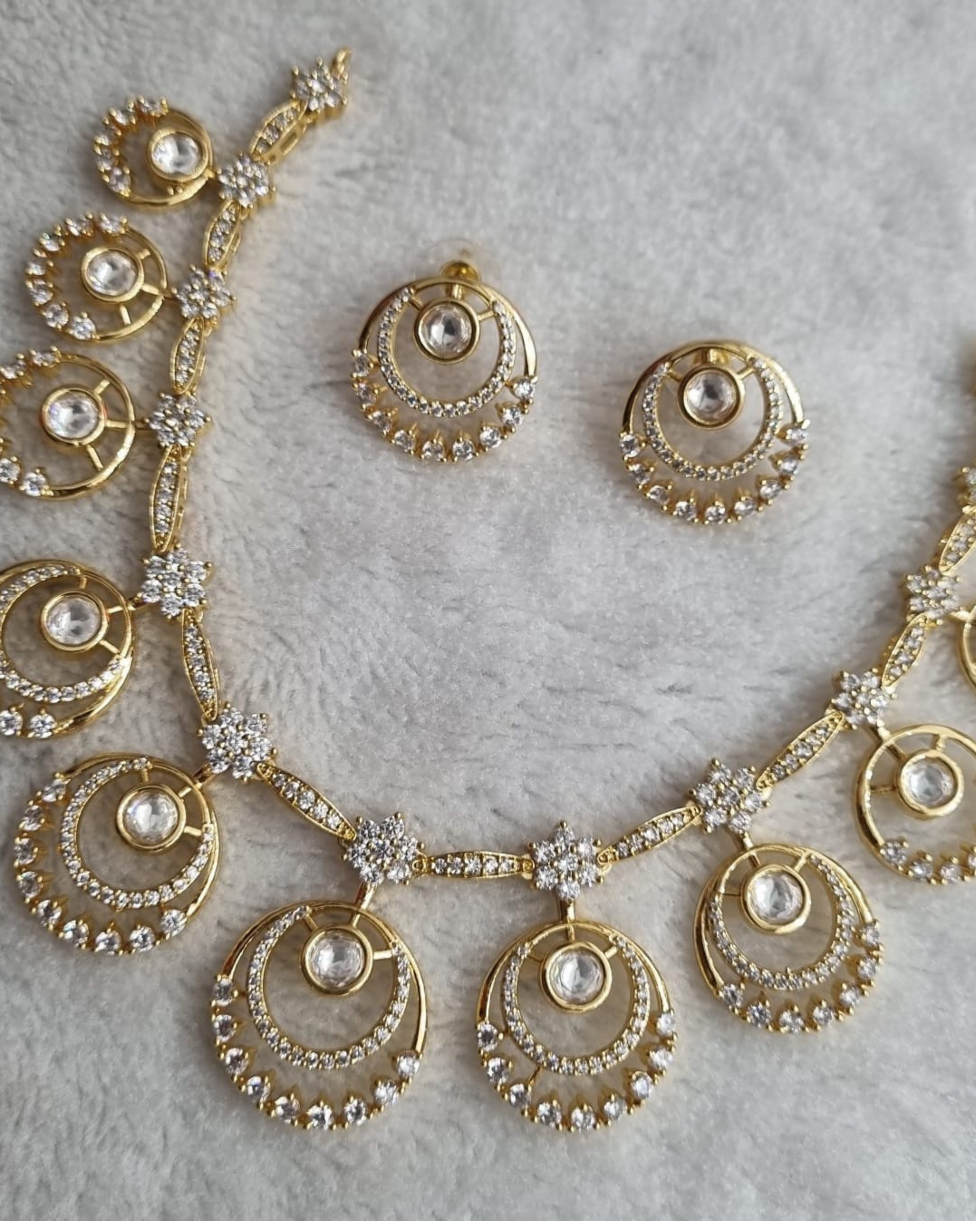 Discover the regal elegance of the Polki/Kundan artistry, featuring luminous white stones and vivid gem-toned accents in gold-toned settings. Whether it's the contemporary Fuschia Halo Choker with its sparkling CZ clusters, the graceful Mint Flora Choker with soft cabochon centers, or the majestic Emerald Droplet Haar with its dazzling long chain, each set includes perfectly matched earrings, making them ideal for elevating any festive, wedding, or formal occasion.