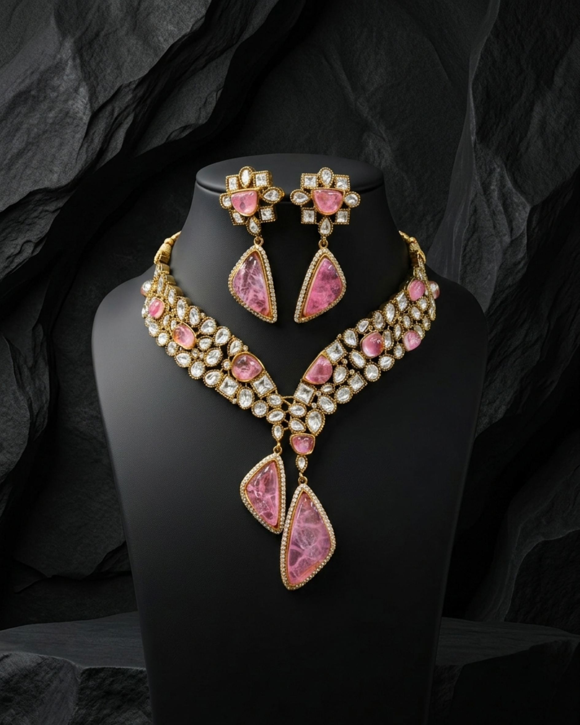 Royal Drop Set is a graceful blend of elegance and statement design. Crafted with finely set stones in a structured V-shaped pattern, the necklace beautifully frames the neckline while the layered drop pendants add depth and movement. The matching drop earrings complete the look with a balanced and refined touch. Perfect for weddings, festive occasions, and special celebrations, this set brings a regal charm to your overall style while maintaining a timeless and sophisticated appeal.