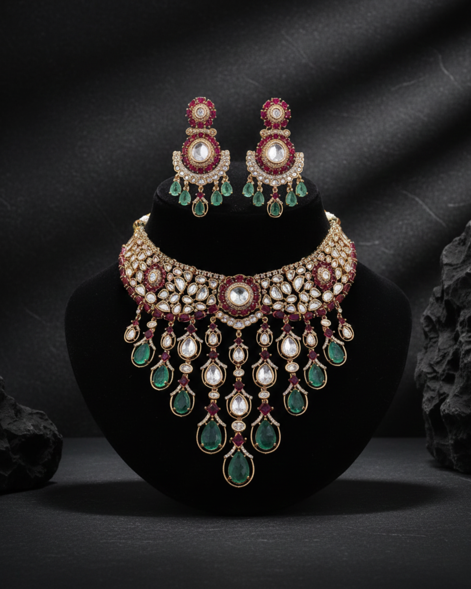 The Saawri Royale Kundan Set is a statement of timeless craftsmanship and regal charm. Designed with intricate moissanite kundan work, this necklace features finely detailed motifs and graceful dangling elements that create a luxurious layered look. Paired with matching earrings, the set reflects traditional elegance blended with refined detailing, making it a perfect choice for weddings, festive celebrations, and grand occasions. Crafted to stand out, this set adds a touch of heirloom-inspired sophistication to every ensemble.