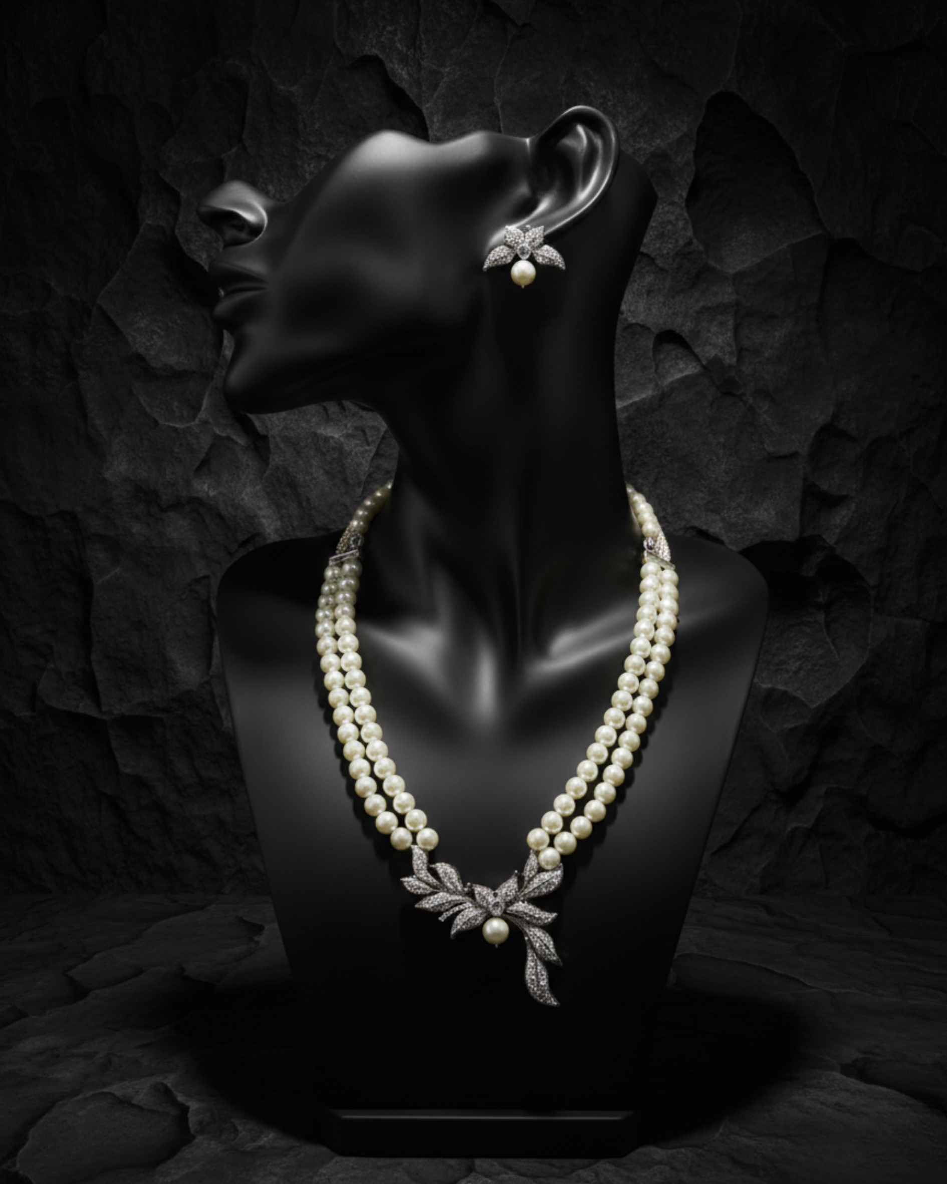 Graceful, regal, and timeless — the Shahi Pearl Blossom Set is a celebration of royal elegance. Crafted with dual strands of luminous pearls, this exquisite necklace is adorned with a magnificent floral statement pendant, intricately encrusted with shimmering stones that reflect brilliance from every angle. A delicate pearl drop at the center enhances its majestic charm. The matching floral stud earrings beautifully complement the necklace, creating a perfectly balanced and luxurious look.