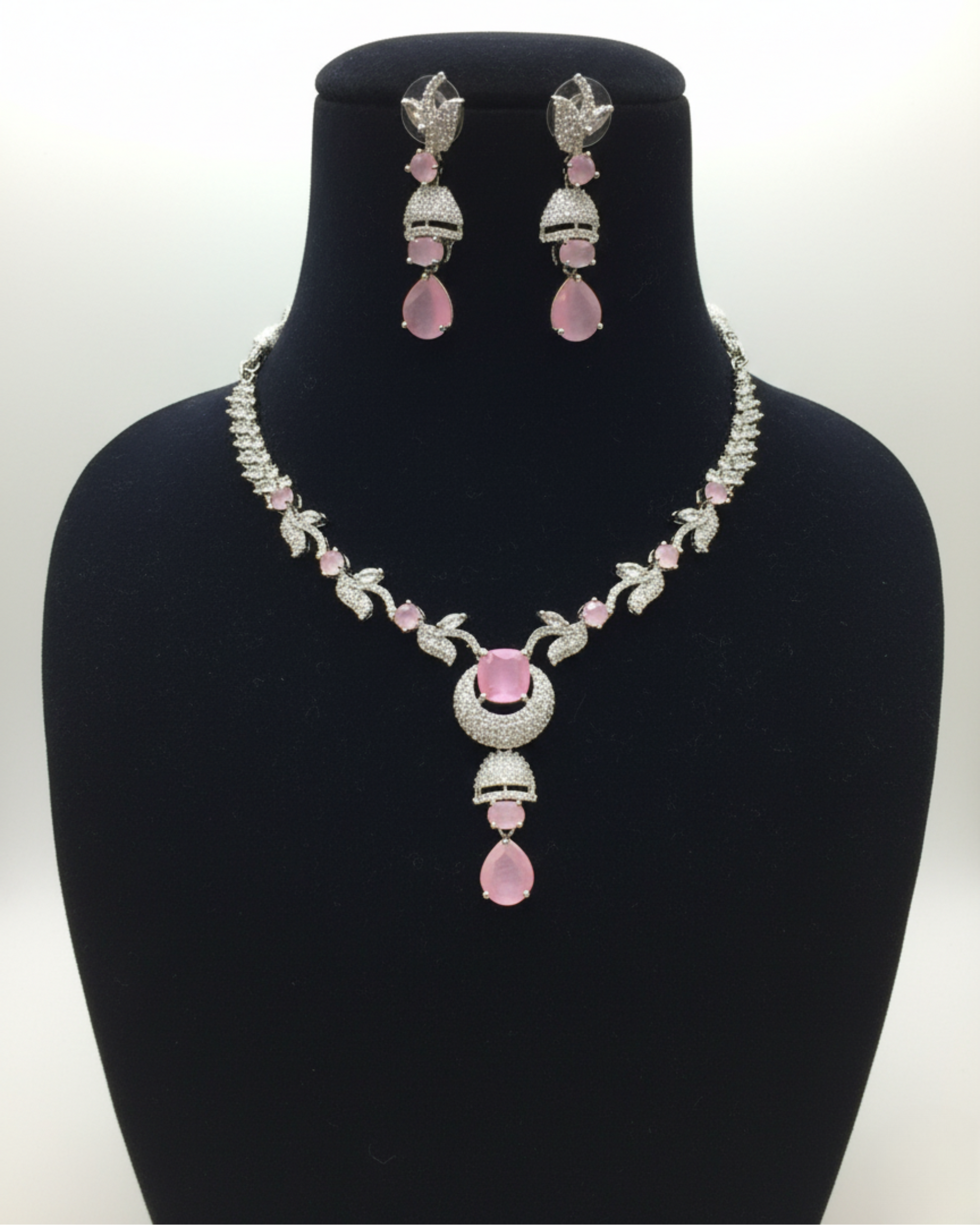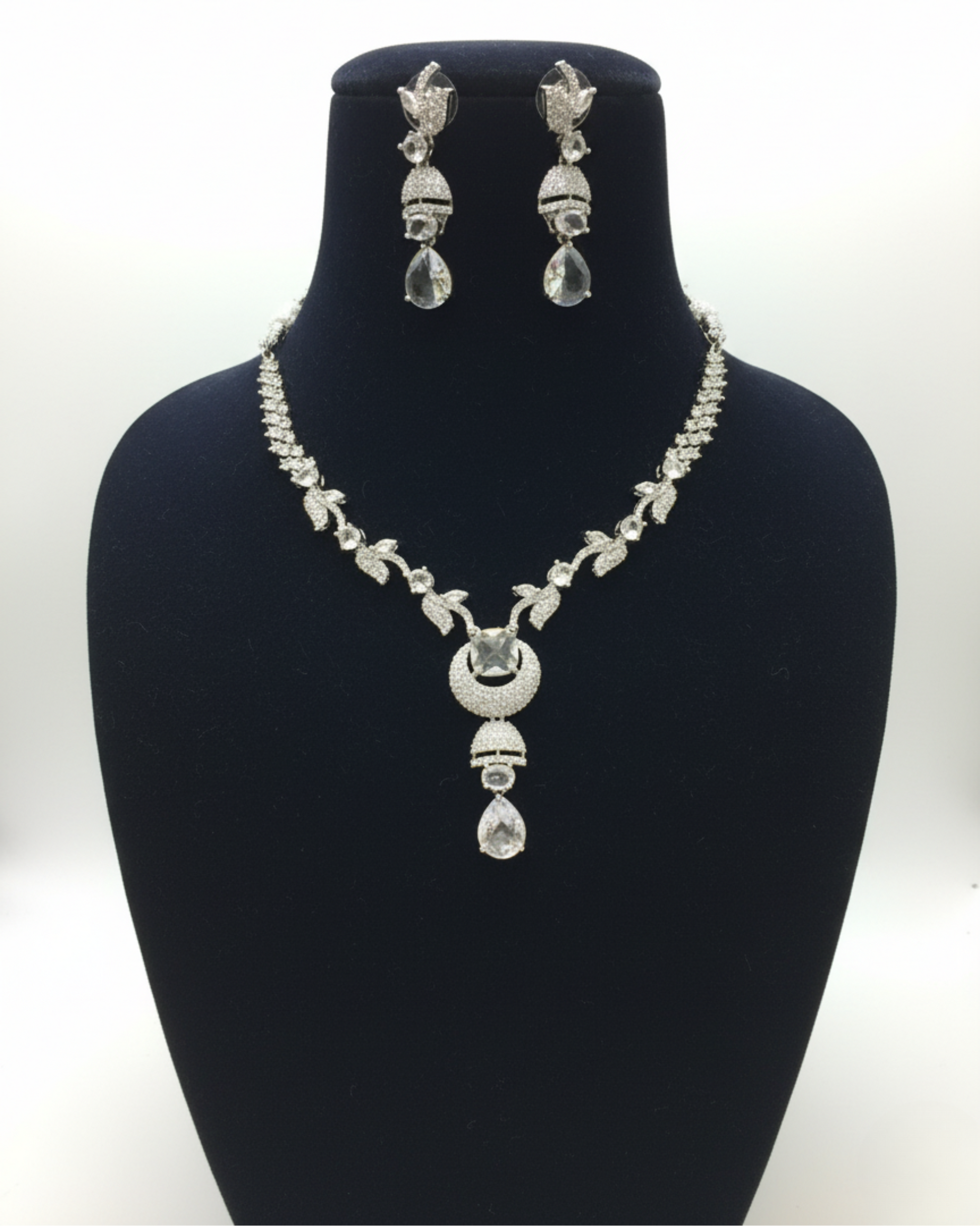 The Symphony Set is a harmonious blend of grace and brilliance, designed to make every moment unforgettable. The necklace showcases an intricate vine-like pattern that flows elegantly into a crescent-shaped centerpiece, embellished with sparkling crystals and a delicate teardrop drop. Paired with matching statement earrings, this set captures the perfect balance of sophistication and shine, ideal for weddings, festive occasions, and timeless celebrations.