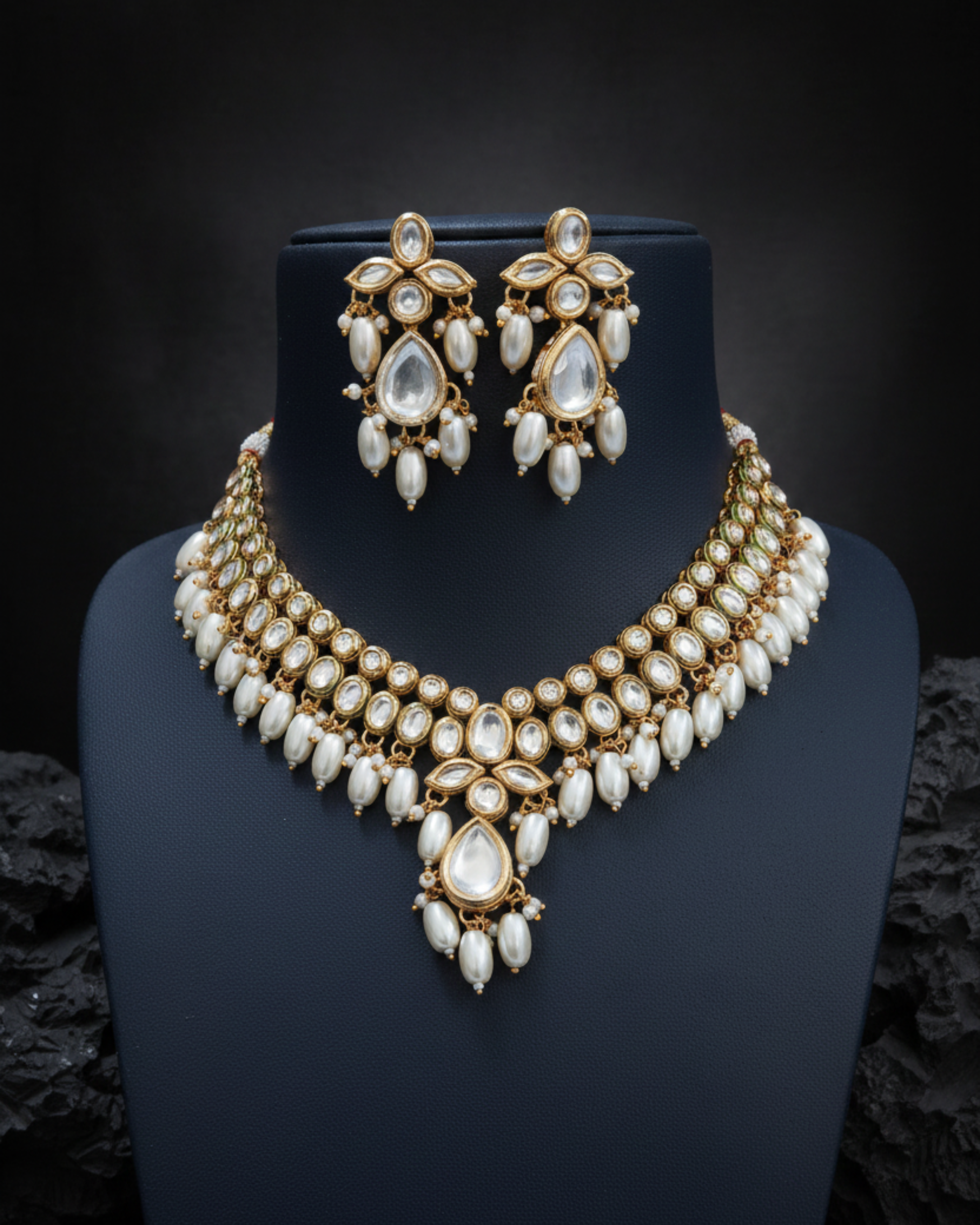 The Timeless Pearl Choker Set is an elegant expression of traditional craftsmanship, perfect for enhancing a sophisticated look. This necklace features a beautifully curved choker design, meticulously adorned with sparkling Kundan stones set in a traditional foil-backed style, radiating pure light. The entire piece, including the matching statement earrings, is gracefully bordered and accented with multiple cascading tiers of rich, lustrous pearl drops. The central pendant on the necklace mirrors the earrings' design, adding a coordinated focal point, resulting in an exquisite set ideal for weddings, ceremonies, and grand festive occasions.