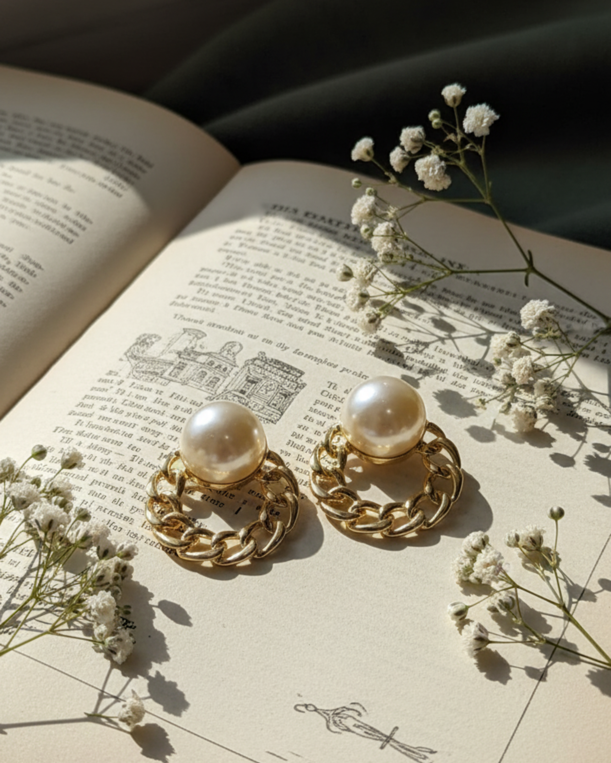 The Urban Classic Drops are a fashion-forward accessory that brilliantly marries two distinct aesthetic traditions. The design begins with a prominent, luminous faux pearl stud, anchoring the piece with timeless, refined elegance. Suspended beneath this classic element is a dramatic, open circular frame constructed from thick, interlocking gold-toned curb chain links, providing a bold, contemporary edge that speaks to modern city style. This striking juxtaposition of the soft, luxurious pearl against the hard, industrial texture of the chain creates a powerful statement, making these drops the perfect accessory for adding sophisticated flair and confident contrast to any ensemble.