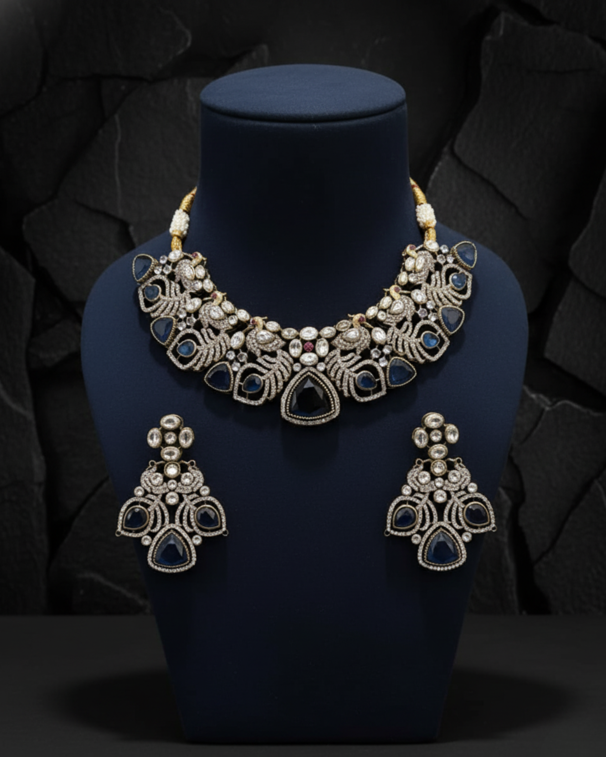The Vanshika Heirloom Set is a magnificent blend of traditional artistry and regal charm. Adorned with intricate detailing and statement motifs, this handcrafted masterpiece reflects timeless beauty passed down through generations. The choker’s exquisite design sits gracefully on the neckline, complemented by matching earrings that add a royal finishing touch — perfect for brides and connoisseurs of heritage elegance.