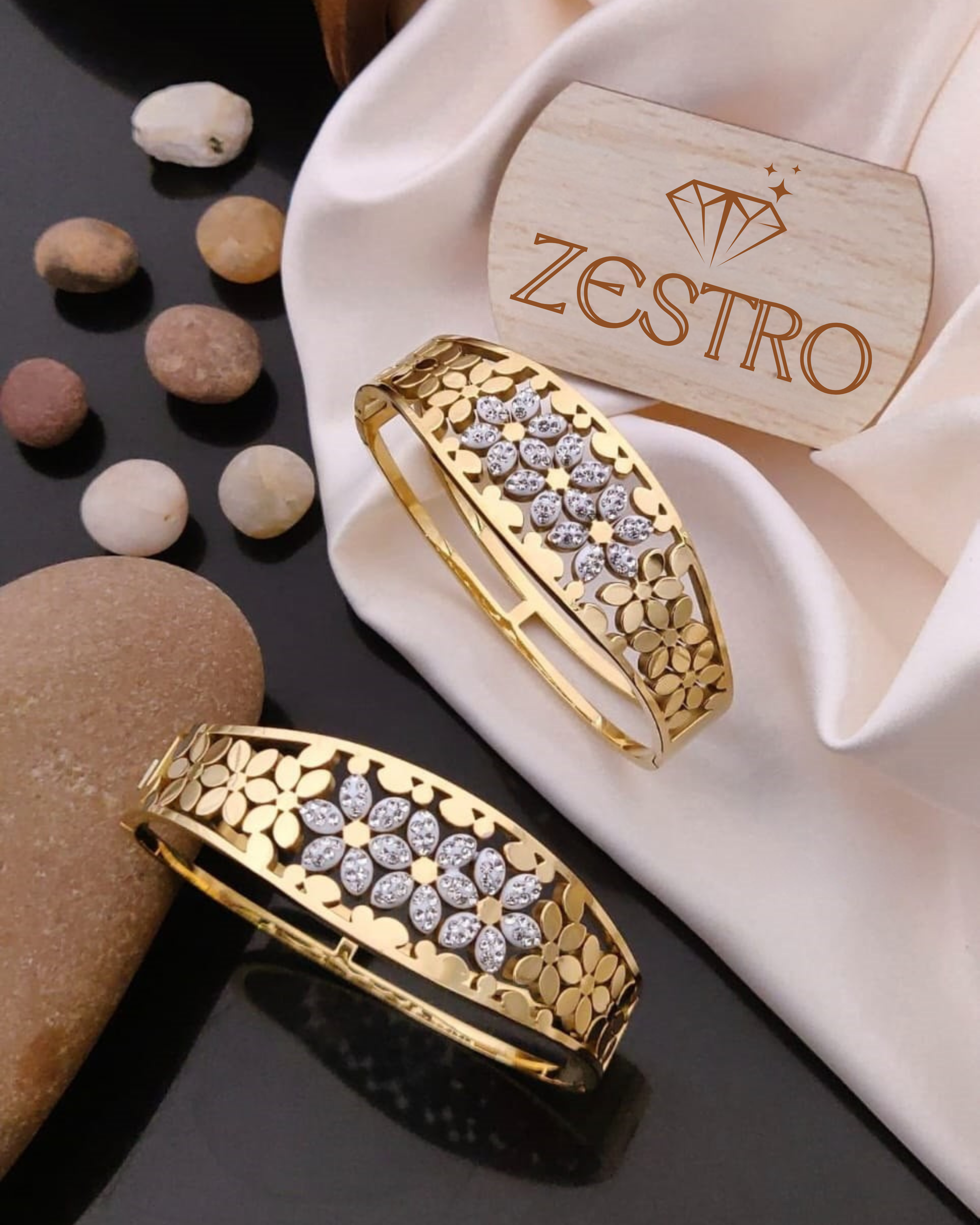 Bold, beautiful, and brilliant. These wide-band gold cuffs feature a stunning laser-cut floral design highlighted by a center cluster of sparkling diamonds. The perfect blend of traditional elegance and modern flair, these bracelets are designed to stand out.